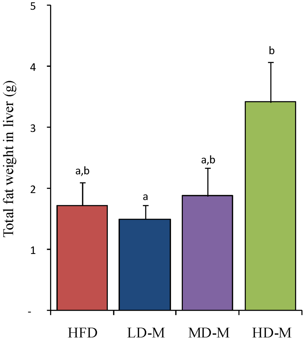 | Liver TAG (μmol/g tissue) | 45 ± 11 a,b | 21 ± 2 a | 19 ± 4 a | 69 ± 14 b | 0.001 |