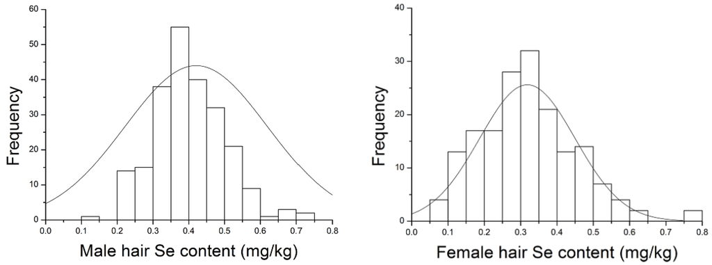 This survey encompassed 234 males and 174 females. The hair Se concentration of both males and females represented a normal statistical distribution (Figure 3). Generally, the hair Se content of males was higher than that of females (Table 1). There existed significant difference (p < 0.05) between hair Se concentration of males and females, except for Liaoning and Shaanxi in the northern areas. Moreover, the hair Se content of males exhibited a more dense statistical distribution than that of females. Among the 234 males, only one had hair Se content lower than 0.20 mg/kg, and 14 (6%) males had hair Se content lower than 0.25 mg/kg. Among the 174 females, 34 (15%) had hair Se content lower than 0.20 mg/kg, while 17 (7%) had Se content less than 0.25 mg/kg. Thirty-eight males (16%) and 15 females (6%) had hair Se content greater than 0.50 mg/kg. The tendency of females to be Se deficient may be related to Se intake because females generally eat less, especially staple food, than males.