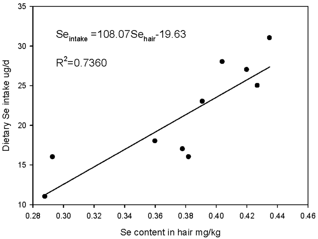 The concentration of Se in hair is a commonly-used index to evaluate body Se load, as it reflects the long-term Se level of the human body [10]. Hair Se had highly significant correlations with the Se concentration in muscle (R = 0.89, n = 15), whole blood (R = 0.90), red blood cells (R = 0.91), blood plasma (R = 0.87) and toenails (R = 0.85) [3,11]. Hair Se can also be used as an important indicator on endemic diseases and may play a critical role in the etiologic research on the Keshan disease, Kashin–Beck disease, and on local selenosis in China [12]. Furthermore, hair Se content was found to regularly increase from the Keshan disease zone (<0.20 μg/g) to the transition zone (0.20–0.25 μg/g) and to the non-disease zone (>0.25 μg/g) [13]. These values reflect the close relationship between the geographical distribution of hair Se and Keshan disease.