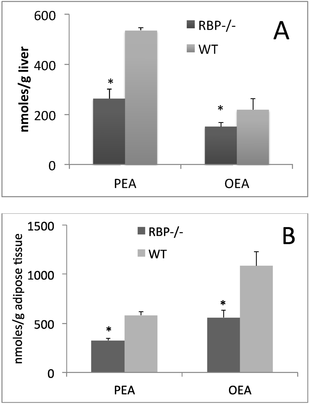 We have recently shown that PPAR-α activation in rodent brain slices increases the biosynthesis of the endocannabinoid congeners, oleoylethanolamide (OEA) and palmitoylethanolamide (PEA) []. Interestingly, both OEA and PEA also induce PPAR-α affecting energy homeostasis [,], probably by sustaining PPARα activity with a positive feedback. Also, PEA is a TRPV1 ligand []. Our preliminary data show that RBP KO mice have lower levels of OEA and PEA in the liver (Figure 1A) and adipose tissue (Figure 1B) when compared to age- and sex-matched wild-type animals. Whether CLA feeding, through induction PPAR-α activity and thus RBP expression, also enhances PEA and OEA tissue levels is not known at the moment and it would be an important question to address.