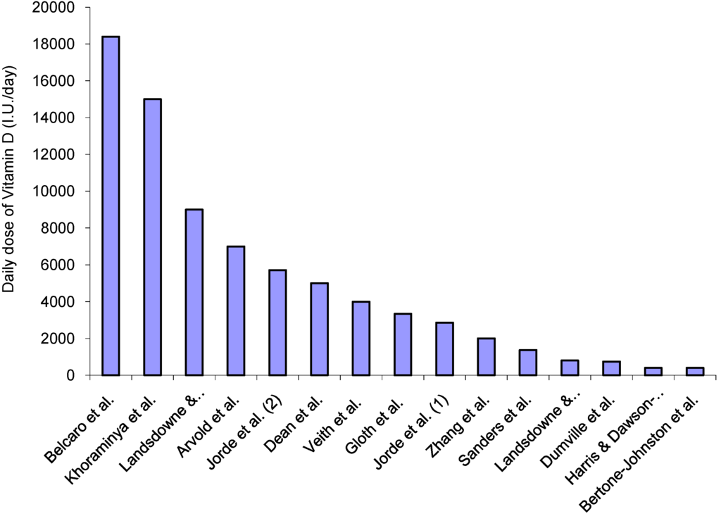 Daily doses varied from 400 I.U. to 18,400 I.U. across the 15 trials (Figure 1). Three studies [30,38,43] used doses lower that 800 I.U./day. In the Women’s Health Initiative [38], the Vitamin D dose would be inadequate to change vitamin levels; the actual dose ingested was ≈200 I.U., as the stipulated dose was 400 I.U. but compliance was 46%. The doses shown in two papers were misprints; reported as 200 mg Vitamin D [42] and 0.25 g of calcitriol [48], equating to millions of international units. However, attempts to clarify this with authors and editors were unsuccessful. The intervention in another study [47] was high dose Vitamin D (500,000 I.U.) probably inducing side effects; a 15% increase in falls and 26% increase in fractures.
