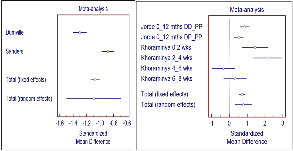 Options for meta-analysis were examined and performed combining the Dumville et al. [43] and Sanders et al. [47] studies, due to the diverse outcome variables used in other studies. There was a statistically significant negative effect of Vitamin D administration evident from the forest plot in the standardized mean differences as shown in the Left Panel of Figure 2. The effect size was −1.1 (CI −0.7, −1.5) (random effects). These studies were of high methodological quality, had similar subjects (community dwelling women aged >70 years) and baseline 25OHD, and used the same outcome measure. The studies differed in the dosing schedule, daily and annually.
