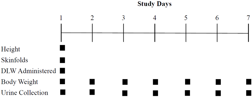 Height, body weight, and body composition were assessed on day 1 of data collection. Vertical height was measured using a stadiometer (Seca; Creative Health Products, Plymouth, MI, USA) to the nearest 0.1 cm. Body weight was measured using an electronic scale (Befour model PS6600; Befour Inc., Saukville, WI, USA) calibrated to industry standards using standard weights accurate to 0.1 kg. Body composition was determined from skinfold thickness measurements using Lange calipers (Beta Technology, Santa Cruz, CA, USA) made at 4 skinfold sites (biceps, triceps, subscapular, suprailiac) [12]. Participant’s weight was measured each subsequent day of data collection.