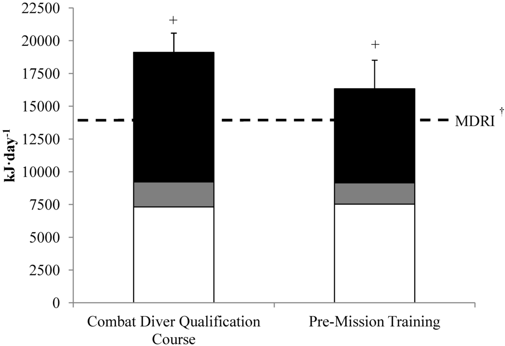 ) diet-induced thermogenesis, (■) activity-induced energy expenditure. + Total daily energy expenditure different from MDRI, P < 0.05; † MDRI; military dietary reference intakes 13,598 kJ·day−1.