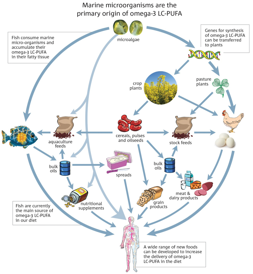 The potential future sources of omega-3 LC-PUFA are shown, with current sources (left) being seafood and microalgae, with possible future sources through genetically engineered plants also indicated at the right.