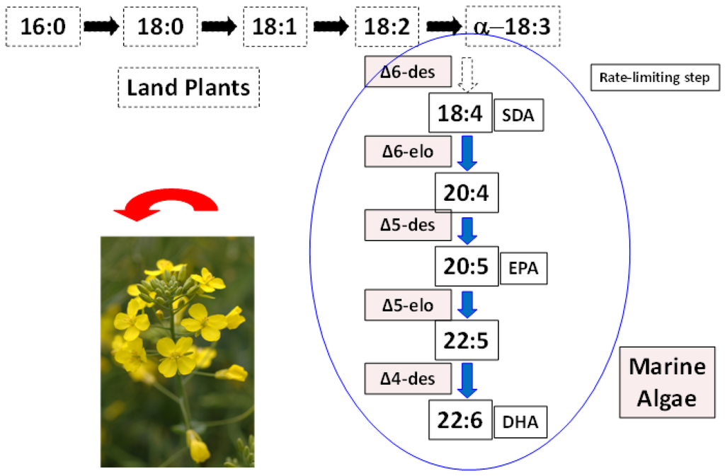 Schematic showing synthesis of shorter-chain fatty acids in land plants (black horizontal arrows), followed by addition of genes from marine microalgae (blue vertical arrows) resulting in new LC omega-3 containing oilseeds. elo, elongase; des, desaturase.