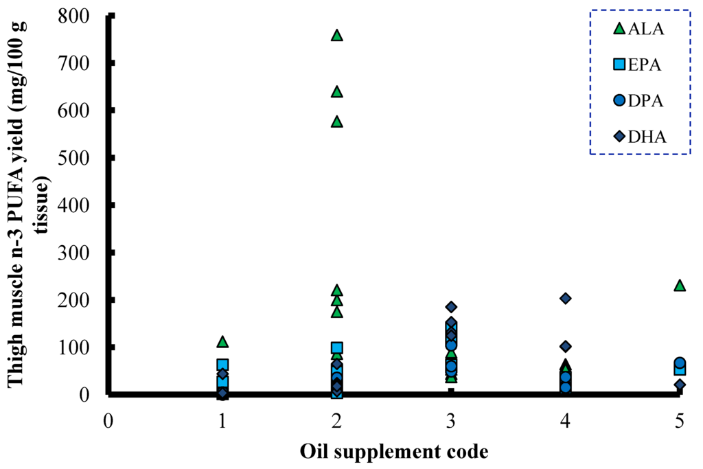 Levels of omega-3 PUFA (ALA) and omega-3 LC-PUFA (EPA, DPA and DHA) in thigh muscle from broilers on a diet with: (1) no oil supplement; (2) vegetable oil; (3) fish oil; (4) marine algae; or (5) SDA-containing oil [,,,,,,,,].