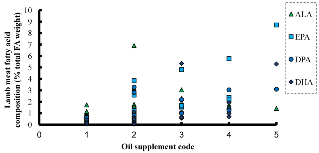 Levels of omega-3 PUFA (ALA) and omega-3 LC-PUFA (EPA, DPA and DHA) in trimmed lean muscle of lambs on a diet with: (1) no oil supplement; (2) linseed or linseed oil; (3) fish oil–vegetable oil mix; (4) fish oil; or (5) fish oil–marine algae mix [,,,,,,,,,].