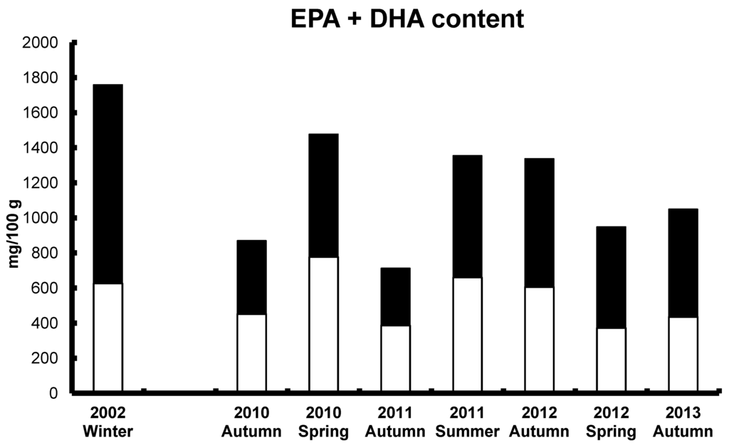 Farmed Atlantic salmon from Tasmania, Australia from 2002 (fish oil diet) [] and 2010 to 2013 (chicken fat/fish oil diet) []: Content of EPA (white bars) and DHA (black bars) (mg/100 g, wet weight).