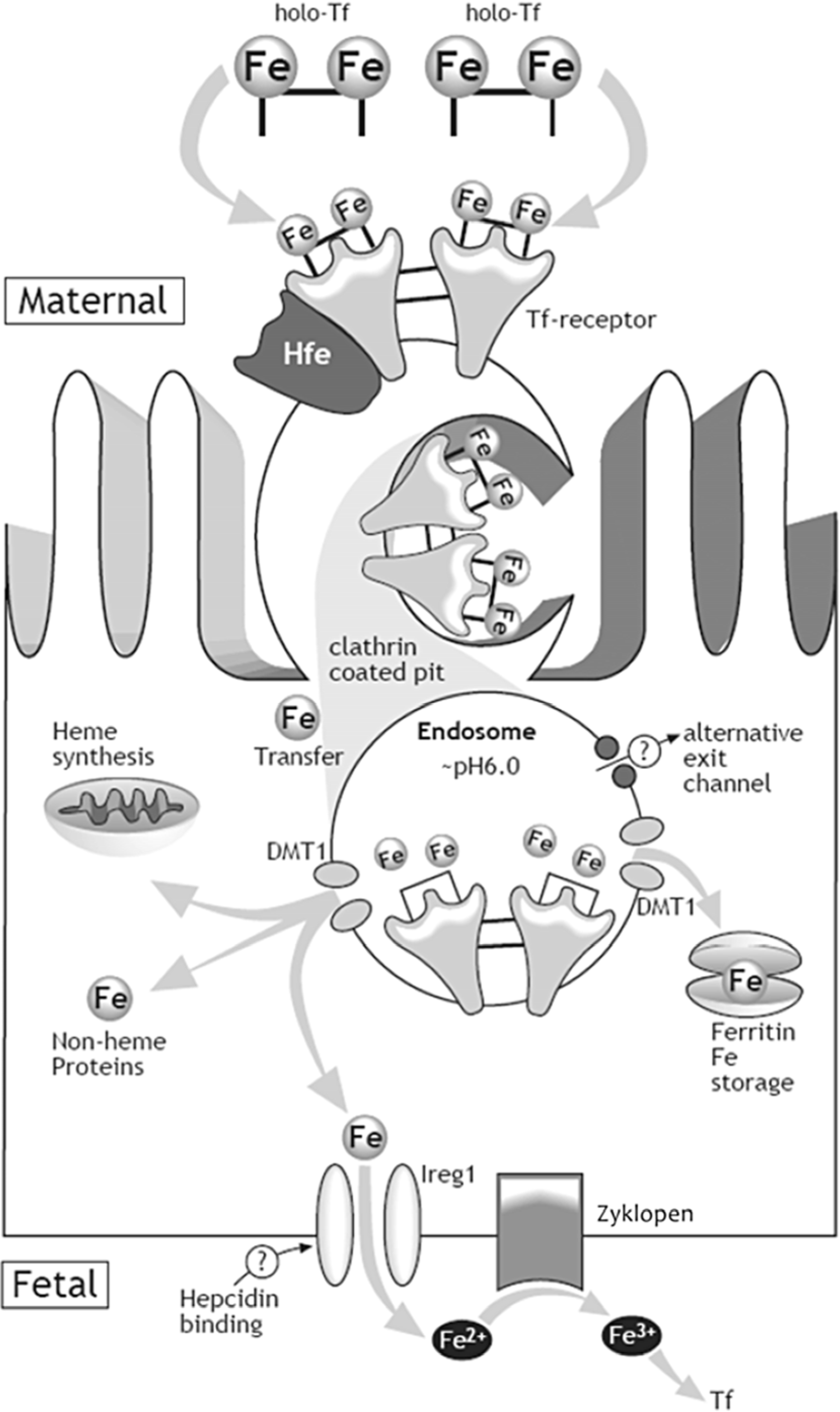 Our current understanding of the mechanism by which iron is transferred from mother to fetus is depicted in Figure 2 [28]. Iron (Fe) is carried in the maternal blood bound to transferrin (Tf). The syncytiotrophoblast, the epithelium on placental villi that interfaces with maternal blood and participates in nutrient exchange, contains Tf receptors (TfR) on the surface facing maternal circulation. The binding of Fe-Tf to TfR depends on the pH levels, having a greater affinity at pH 7.4 [29]. After binding, the Fe-Tf/TfR complex is endocytosed, and the vesicle is acidified through activation of hydrogen pumps [30]. The lower pH allows the dissociation of iron from the maternal Tf. Once released, iron is actively transported out of the vesicle into the cytosol where it is used for cellular processes, stored in ferritin or exported into fetal circulation. The TfR and Tf then return to the maternal surface of syncytiotrophoblast where Tf is released into the maternal circulation and the cycle repeats [30]. Iron is exported from the basolateral side of the synctiotrophoblast into fetal circulation by ferroportin (Fpn) [30], the only know iron exporter in vertebrates. In fact, knockout of Fpn in mice causes embryonic lethality due to severe iron deficiency of the embryo [31]. Following iron export through Fpn, a ferroxidase (possibly zyklopen) [32] oxidizes iron so it can be loaded onto fetal transferrin.