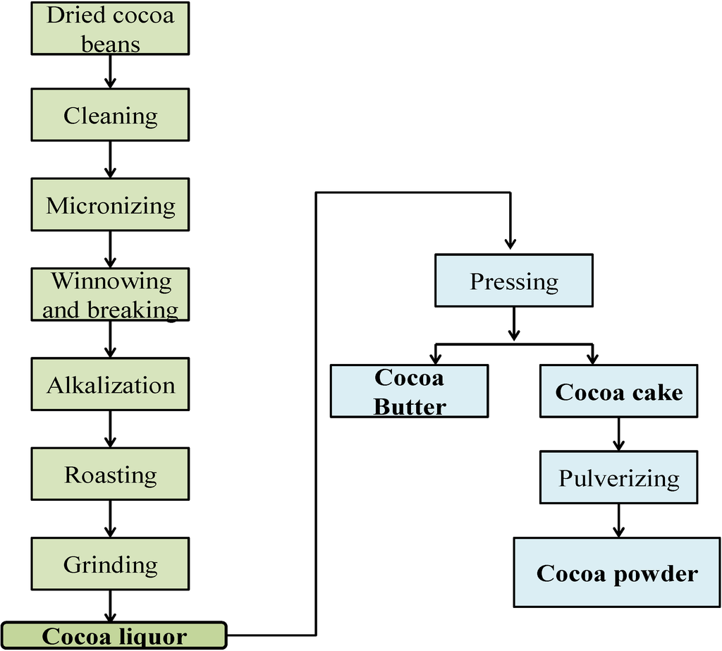 Seeds from Theobroma cacao L. (Sterculiaceae) are the base for the production of the most important and widespread functional food in human history. The origin of cocoa dates back to more than 3000 years ago, and it was used for nutritional and medicinal purposes by the Mayan and Aztec civilizations [1]. Numerous reports have focused on various health-beneficial effects associated with the consumption of cocoa products [2]. Although the cocoa plant contains an enormous range of beneficial components, processing and manufacturing alters its content and bioactive moieties, particularly during roasting, fermentation and drying, as well as with the use of analytical methods for isolation, characterization and quantification of its bioactive compounds. For instance, the production of cocoa liquor (a dark brown fluid obtained by grinding cocoa nibs), which is a combination of cocoa butter and cocoa powder, involves the cleaning of the seeds followed by fermentation, drying and roasting steps. The time and temperature conditions during the roasting process affect the flavor characteristics and nutrient profile of the final product [3]. The liquor may then be processed with alkali, also known as Dutch processing or Dutching, to increase the pH and improve palatability. Furthermore, the alkalizing stage affects the chemical composition of the cocoa liquor [4]. The chemical profile of roasted cocoa beans is complex, and the primary compounds that induce its multiple beneficial functions are naturally occurring or process-derived flavonoids, theobromine and magnesium. A summary of the manufacturing steps is shown in Figure 1. The term “cocoa component” is intended to refer to a fraction derived from shell-free cocoa nib and includes chocolate liquor, partially- or fully-defatted cocoa solids, cocoa extracts, cocoa butter and cocoa nib. The potential health implications of biologically active substances present in cocoa components are well documented. Many epidemiological studies associate cocoa and chocolate consumption to a reduced risk of chronic diseases, and various health benefits of the cocoa compounds have been attributed to its antioxidant and anti-inflammatory potency [5]. In particular, the bioactive constituents of cocoa components exhibit pharmacologic effects in reducing inflammatory processes [6]. This is based on their ability to downregulate pro-inflammatory cytokines and their downstream biochemical pathways [7]. In addition, according to Lee et al. [8] phenolic and flavonoid contents and total antioxidant capacities of cocoa are higher than that of other phytochemical-rich foods. The antioxidant effects of the cocoa components may influence insulin resistance, reduce the risk for diabetes or stimulate redox-sensitive signaling pathways involved in the gene expression of endogenous antioxidant defenses [9]. Diet has been recognized as an important modifier of health status, and dermal health can be greatly affected by food composition. Although this is an emerging area of research and more robust findings are required, it was reported that the consumption of cocoa rich in phytochemicals may help to maintain skin health and confer photoprotection [10]. After a brief overview of typical phytochemicals present in cocoa, we will review the beneficial impact of cocoa and chocolate consumption on human health with special emphasis on skin physiology.