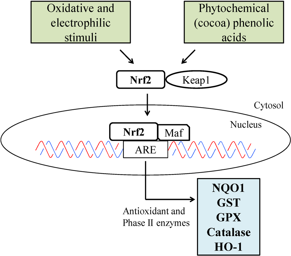 In recent years, there has been a growing interest, supported by a large number of experimental and epidemiological studies, for the beneficial effects of some phenolic substances, contained in commonly used spices and herbs, in preventing various age-related pathologic conditions, ranging from cancer to neurodegenerative diseases. Although the exact mechanisms by which polyphenols promote these effects remain to be elucidated, several reports have shown their ability to stimulate a general xenobiotic response in the target cells, activating multiple defense genes, activating a number of different molecular targets, impinging on several signaling pathways and showing pleiotropic activity on cells and tissues. Cocoa polyphenols, mainly flavanols in both monomeric and oligomeric form, have been shown to act as a strong antioxidants, having the potential to inhibit lipid peroxidation and to effectively intercept and neutralize ROS. In this regard, cocoa flavanols have been demonstrated to be more potent than other food polyphenols. The tricyclic structure of the flavonoids determines their antioxidant effects; phenolic quinoid tautomerism and the delocalization of electrons over the aromatic system scavenge ROS. These aromatic rings directly neutralize free radicals and chelate metals (Fe2+ and Cu+) that enhance ROS. Due to the good bioavailability, cocoa intake increases serum antioxidant capacity, protecting the endothelium from oxidative stress and endogenous ROS [36], although contemporary milk assumption decreases this ability [37]. Beyond their ROS quencher activity, cocoa polyphenols effects have been mostly associated with cocoa’s ability to interfere at a molecular level with numerous cellular antioxidant pathways. They strongly inhibit enzymes involved in ROS production. Enzymes inhibited by cocoa flavonoids include xanthene oxidase, NADPH-oxidase, tyrosine kinases and protein kinases [38]. Furthermore, cocoa flavanols have been shown to upregulate antioxidant defenses by overexpressing highly protective inducible genes involved in the cellular stress response, such as the activation of the nuclear factor erythroid 2-related factor 2 (Nrf2) signaling pathway (Figure 2). Nrf2 is a conserved master regulator of cellular antioxidant responses. Nrf2 belongs to the Cap’n’Collar family leucine zipper transcription factors and regulates the expression of genes encoding anti-oxidant and detoxifying proteins, such as glutathione S-transferase (GST), glutathione synthetase (GSS), heme oxygenase-1 (HO-1) and NAD(P)H:quinone oxidoreductase. Among the genes activated by Nrf2, HO-1 has been the object of intensive studies for its potential role in protecting several tissues against cell death [39]. Cocoa extract has been recently shown to efficiently induce HO-1 expression through the activation of Nrf2 in mice and, by this, to protect neurons against different challenges [40]. Flavonoids have a number of other properties that may contribute to their protective and healing effects, including anti-inflammatory and antiplatelet activity, immunoregulatory properties and beneficial effects on vascular endothelium. The epicatechin content of cocoa is primarily responsible for its favorable impact on vascular endothelium, which is the result of both acute and chronic upregulation of nitric oxide (NO) production [41]. NO synthesis is the most investigated endothelial function in relation to cocoa over the past 10 years, and many authors have reported that cocoa polyphenols significantly increase plasma concentrations of NO [42]. The predominant mechanistic hypothesis is that cocoa components, in particular epicatechin, stimulate endothelial nitric oxide synthases (eNOS) activity, inhibit arginase and NADPH oxidase, leading to lower levels of superoxide and, hence, higher levels of NO. Although this is not the only mechanism involved, a substantial increase in NO synthesis may account for flow-mediated dilation and lower blood pressure following intervention treatments. Cocoa procyanidins are also potent inhibitors of mitogen-activated protein kinase kinase (MEK) and membrane type-1 (MT1)-matrix metalloproteinase (MMP). They subsequently inhibit the expression and activation of pro-MMP-2, as well as the invasion and migration of human vascular smooth muscle cells (VSMCs) [43]. Both of these mechanisms have a critical relevance, not only in flavanols cardioprotective effects, but also for their potential use in cancer prevention and photoprotection. Ramiro et al. [44] studied the effects of a cocoa extract on the secretion and RNA expression of various proinflammatory mediators by macrophages. Of these, monocyte chemoattractant protein (MCP)-1 and tumor necrosis factor (TNF)-α were significantly and dose-dependently diminished by the extract. All cocoa flavonoids tested were capable of reducing MCP-1 secretion after 6 h of LPS activation. The regulatory effects of cocoa flavanols on nuclear factor-κB (NF-κB) activation have also been studied. (−)-Epicatechin, (+)-catechin and their dimeric forms were found to inhibit the NF-κB activation induced by phorbol esters in T-cells, with a clear reduction of NF-κB-DNA binding activity that leads to a reduction in interleukin 2 (IL-2) production. These effects were related to the direct interaction with the inhibitor of κB (IκB) to prevent its phosphorylation, thereby preventing NF-κB activation [45].