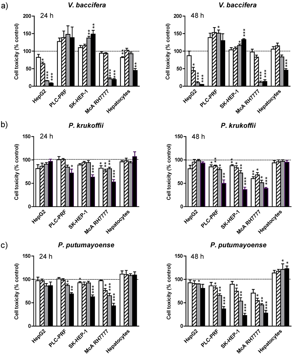 Effects of (a) V. baccifera; (b) P. krukoffii; and (c) P. putumayoense leaf extracts on the cytotoxicity to tumor cell lines and primary hepatocyte cultures. The extracts were assayed at the concentrations: