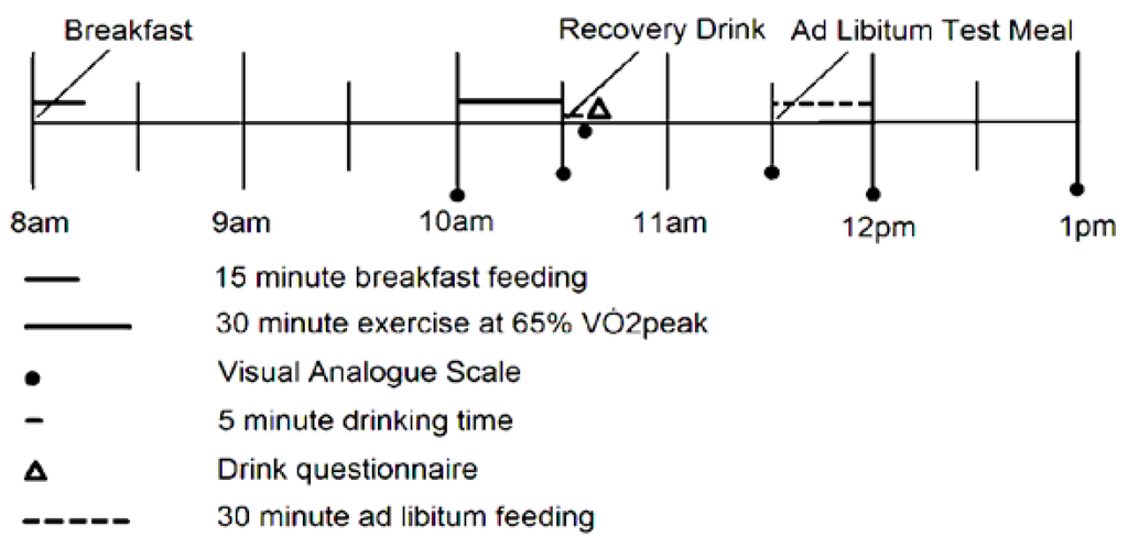 The participants were asked to consume a pre-prepared breakfast at 08:00 at home and subsequently arrive at the laboratory at 09:45. The 30-min continuous exercise was conducted on the cycle ergometer at 65% ± 4% of the participants individual . Expired air (L·min−1), heart rate (bpm) and RPE scores were obtained at the following time points: 9–10 min, 19–20 min and 29–30 min. The recovery drink of either skimmed milk or an orange drink was provided immediately after exercise completion, in an opaque bottle, and consumed within 5 min. An ad libitum pasta meal was made available to the participants 60 min after drink ingestion with a maximum feeding time of 30 min. Subjective appetite sensations (hunger, prospective food consumption and fullness) were assessed using visual analogue scales (VAS) at the time points identified in Figure 1.