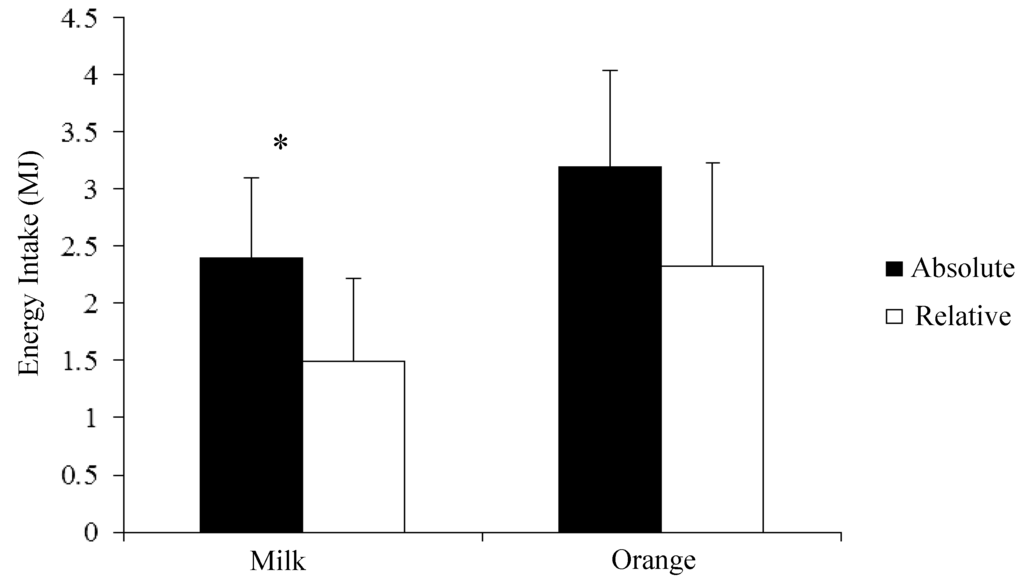 Mean (± SD) absolute and relative energy intake (MJ) (ad libitum test meal), following 30 min of moderate–vigorous exercise at 65% between milk and orange juice trials (n = 9). * Energy intake significantly lower for absolute and relative conditions (p = 0.001 and p = 0.005, respectively).