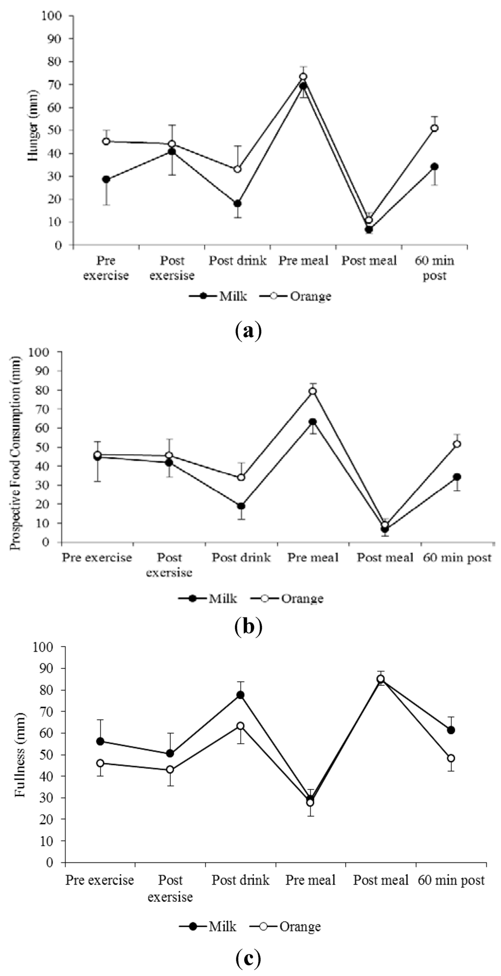 Taking a novel approach, the present study was the first to investigate the effects of skimmed milk and an orange drink on subsequent ad libitum energy intake following moderate intensity cycling exercise in recreational females. Although other studies using dietary interventions have highlighted the satiating effect of milk on subsequent energy intake in both males and females [11,21], none have investigated this effect succeeding the completion of exercise. This study therefore identified that the consumption of skimmed milk following 30 min of moderate–vigorous cycling exercise resulted in a significant reduction in subsequent energy intake in female recreational exercisers (0.81 MJ or ~25% lower compared to the orange juice trial). Such an alteration in eating behaviour was not accompanied by any fluctuations in subjective appetite (hunger, prospective food consumption or fullness). Despite this, the reduction in energy intake of 0.81 MJ can be described as a worthwhile change, given that several authors have identified energy intake deficits of 170 kcal (712 kJ) and 175 ± 45 kcal (733 ± 188 kJ) per day [22,23] to be “clinically” meaningful from a weight loss/maintenance perspective.