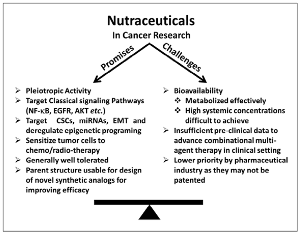 The importance of nutraceuticals as anticancer agents is increasingly being recognized. They hold a lot of promise, as evidenced by multiple reports on their ability to modulate key signaling pathways/molecules that influence tumorigenicity. However, some challenges, particularly their bioavailability, have hindered their progress through clinical trials. In order to realize the true potential of nutraceuticals as anticancer agents, the challenges need to be overcome.