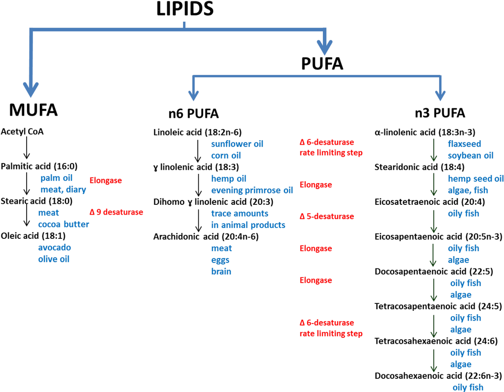 The biosynthesis pathways of the omega 3, 6 and 9 family of poly- and mono-unsaturated fatty acids (adapted from [21,22,23]).The main dietary sources are shown in blue text, and the enzymes in red text.