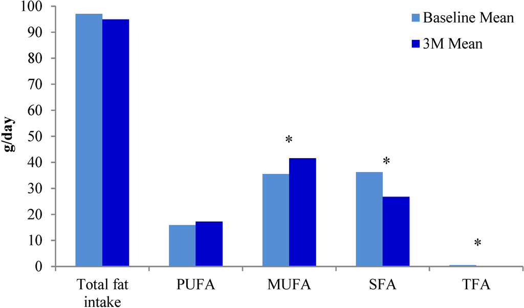 Changes in types of dietary fat intake from baseline to three months.* Statistically significant p values; PUFA: polyunsaturated fatty acids; MUFA: monounsaturated fatty acids; SFA: saturated fatty acids; TFA: trans fatty acids.