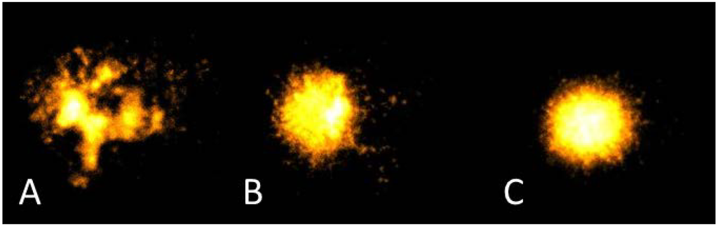 Representative images of different levels of DNA damage as measured by the Comet assay. A: extensive damage; B: moderate damage; C: minor damage.