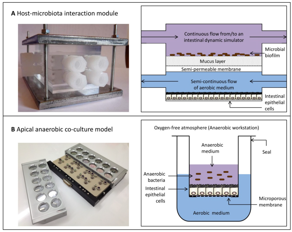 Figure 2. Comparison of two examples of dual-environment co-culture models. (A) The Host-Microbiota Interaction (HMI) module enables the co-culture of a complex microbial community, including obligate anaerobic bacteria, with enterocyte-like cells [129,130]. This in vitro model consists of two compartments, the upper compartment representing the luminal side containing a complex microbial community and the lower compartment containing enterocyte-like cell lines. These two compartments are separated by a polyamide semipermeable membrane and a mucus layer. The HMI module can be used to investigate host-microbiota interactions for up to 48 h. (B) The apical anaerobic co-culture model also contains two compartments. The upper compartment contains anaerobic medium to enable the survival of obligate anaerobic bacteria and the lower compartment is filled with aerobic medium to enable the survival of oxygen-requiring human IECs. In this model the two compartments are separated by a microporous membrane, on which IECs are seeded. By diffusion through the microporous membrane, IECs receive oxygen from the lower aerobic compartment. The apical anaerobic co-culture model has been validated to study host-microbial interactions for up to 12 h [99]. Photograph of the HMI module is used with permission from Marzorati et al. [130], Agro Food Industry Hi-Tech, Tekno Scienze © 2012. Schematic of the HMI module is adapted from Marzorati et al. [129], BMC Microbiology, published by BioMed Central, 2014.