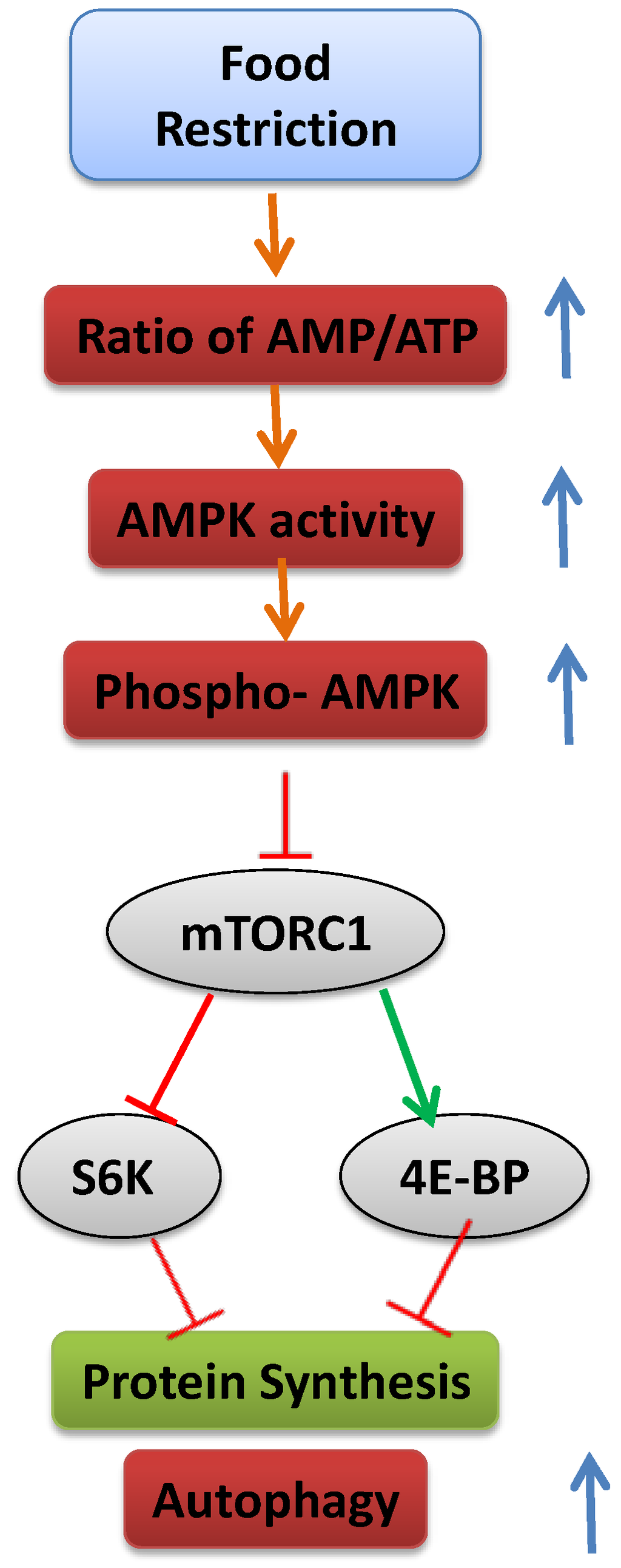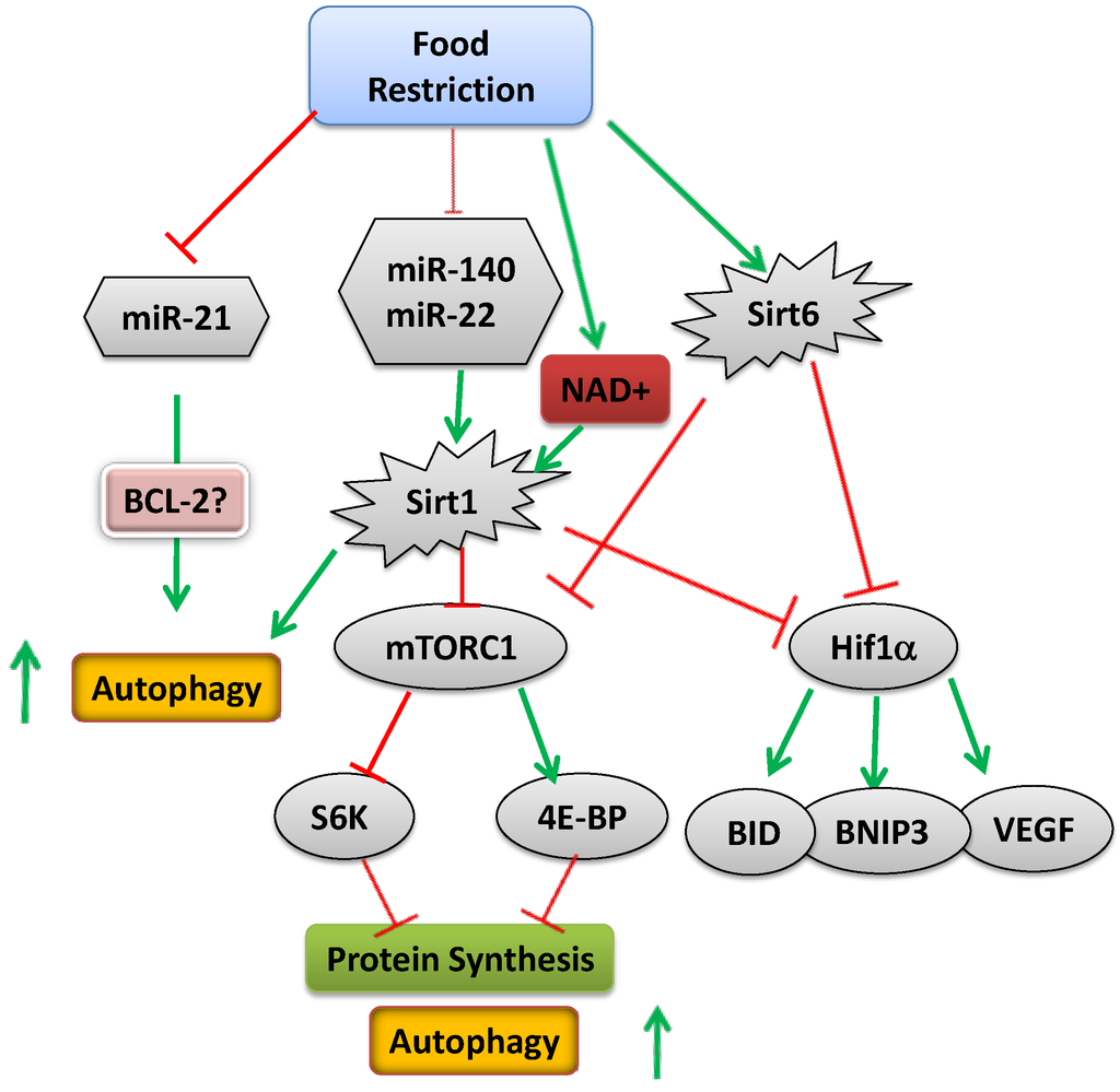 Schematic representation of the mechanism activated upon food restriction (green arrows indicate increased activity or level; red arrows indicate reduced activity or level).