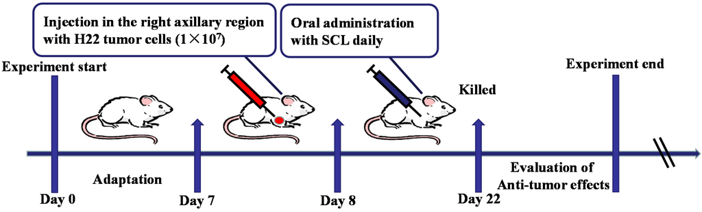 After an acclimatization period of one week, to establish the murine solid tumor H22 transplanted model, corresponding ascites tumor cells (0.2 mL, 2 × 106 cells per mouse) were subcutaneously injected into the right axillary region of the mice in all groups (Day 7). Twenty four hours after inoculation (Day 8), the animals were randomly divided into five groups (n = 10) and treated for 14 days as follows: (i) the model group: animals received saline intragastrically; (ii) the CTX group (positive control group): animals received CTX (25 mg/kg) by intraperitoneal injection; (iii) the low and high dosage SCL-treated groups: animals received SCL test solution (200 and 400 mg/kg) intragastrically. The mice weights were recorded before and after each drug administration. Twenty four hours after the last administration of tested drug on the 22nd day of the experiment, blood samples were collected from the mice’s eyes, and serum was harvested by centrifugation. Then, all of the mice were sacrificed, and the whole bodies, the segregated tumor, thymus and spleen of the mice were weighed immediately. The tumor inhibitory rate was calculated by the following formula: tumor inhibitory rate % = (tumor weight of model group − tumor weight of tested group)/tumor weight of model group × 100. The volume of the solid tumor was measured with a digital caliper every other day. The values obtained were calculated according to the equation: V (mm3) = A × B2/2, where A and B represent the largest diameter and the smallest diameter, respectively. The tumor tissues of mice were collected for pathological sectioning with H&E and Hoechst 33258 staining. The experimental design is shown in Figure 1.