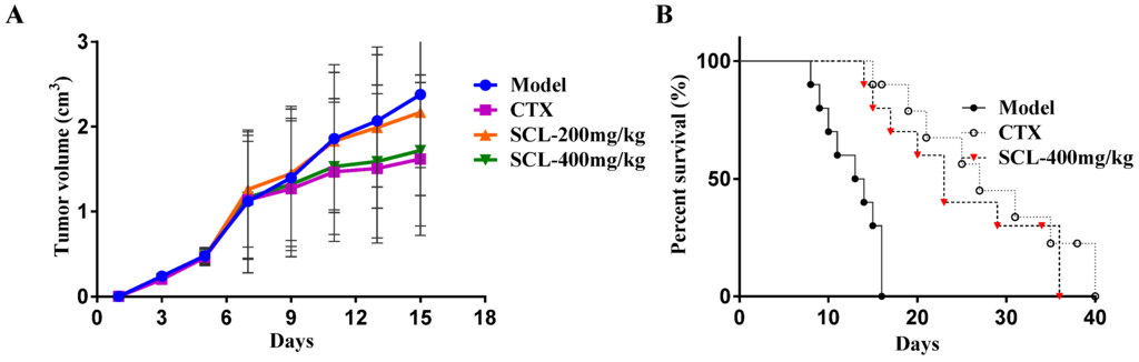 Figure 2A shows the tumor volume growth curves; the results indicated that the tumor volumes of the mice in the model group increased rapidly during the 14-day duration with their mean volumes reaching more than 2.3 cm3 at Day 15. In contrast, the treatment of SCL and CTX significantly suppressed the tumor growth (p < 0.05). From the ninth day, the average tumor volume in SCL- and CTX-treated mice had increased relatively slowly.