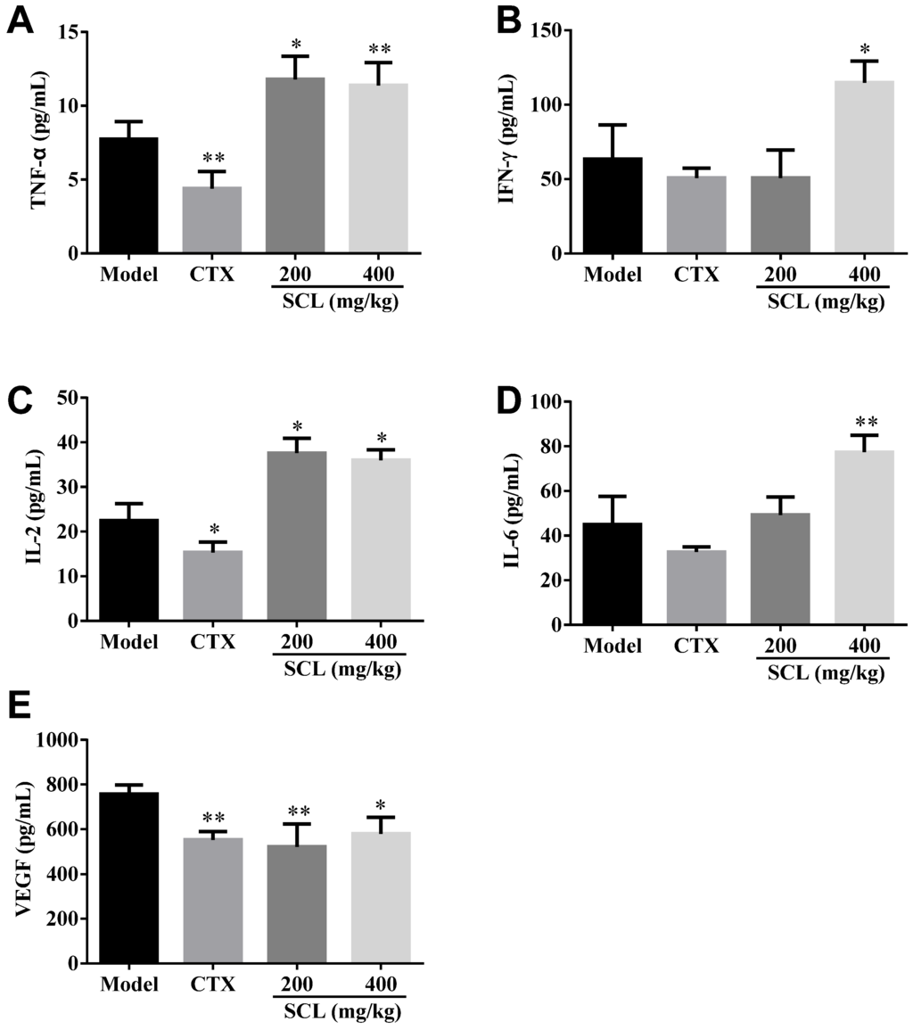 VEGF is considered an important growth factor implicated in tumor angiogenesis and can also be used as a tumor marker [27]. As shown Figure 5E, SCL treatment could significantly inhibit the expression of VEGF in a dose-dependent manner, coinciding with the decrease of VEGF level in serum. The above observation is a hint for the possible role of SCL as an angiogenesis inhibitor on H22 tumor-bearing mice.