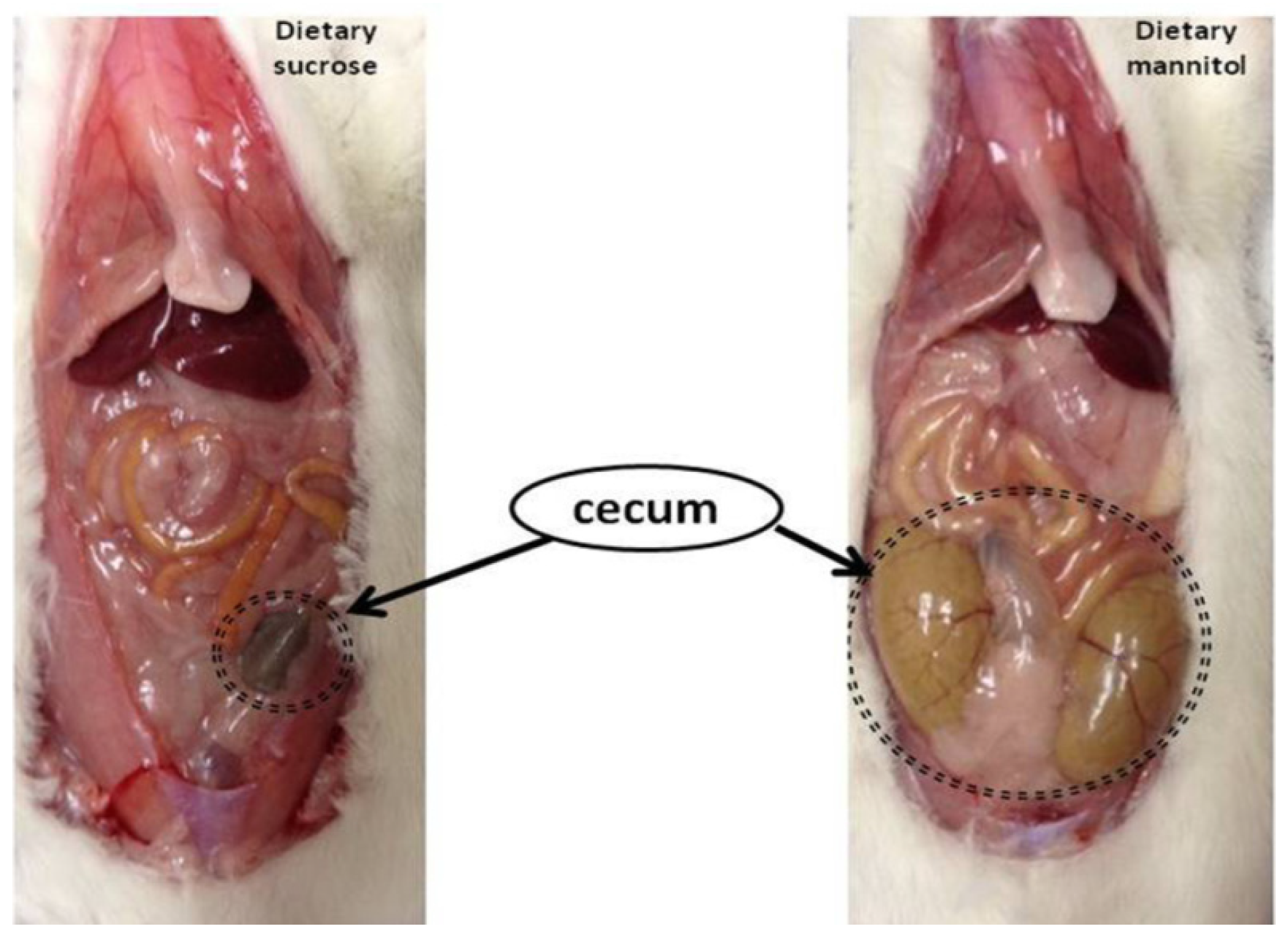 An enlargement of intestinal bowel has also been recognized as one beneficial physiological effect of iS ingestion. Important implications of enlargement in large bowel size are greater fermentation capacity and an increasing role of the hindgut in nutrient absorption in those animals. In rats, greater substrate availability for fermentation in the large intestine, due to mannitol supplementation, led to an enlargement of cecum compared to rats consuming digestible sugars such as sucrose (Figure 2). Indeed, in this research, as shown in Figure 2, dietary mannitol supplementation resulted in multifold larger and heavier cecum than in rats fed dietary sucrose.