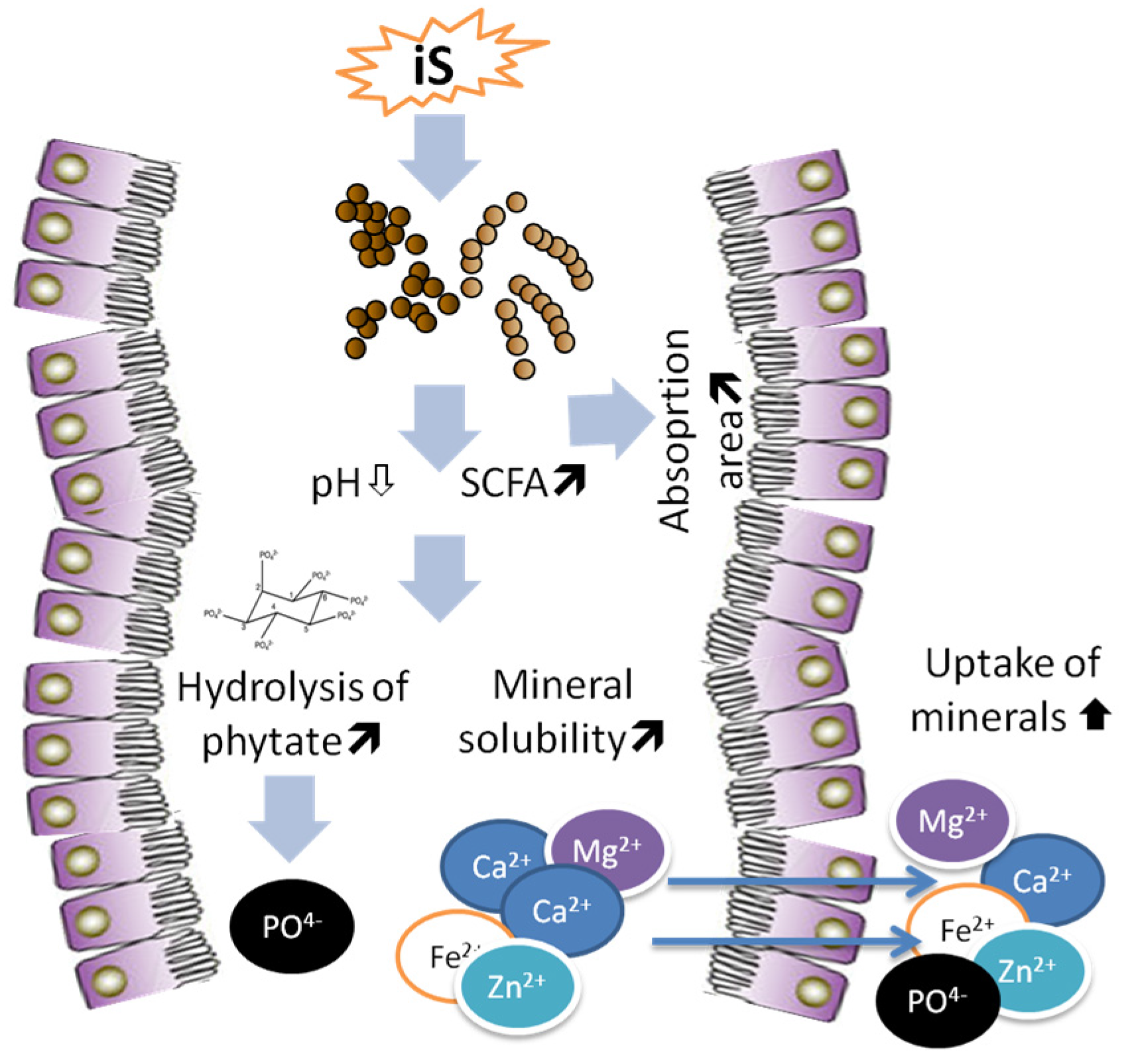 Typically, beneficial effects of iS on enhancing the bioavailability of minerals were combined with improvements of SCFAs formation, decreased luminal pH, and enlargement of intestinal wall tissue in the above researches. Hydrolysis of phytic acid contained in the cereal-based diets via iS fermentation [69] may also contribute to a higher bioavilibility of P and other minerals such as Ca, Mg, Zn, which normally are bound by phytic acid [86,89].