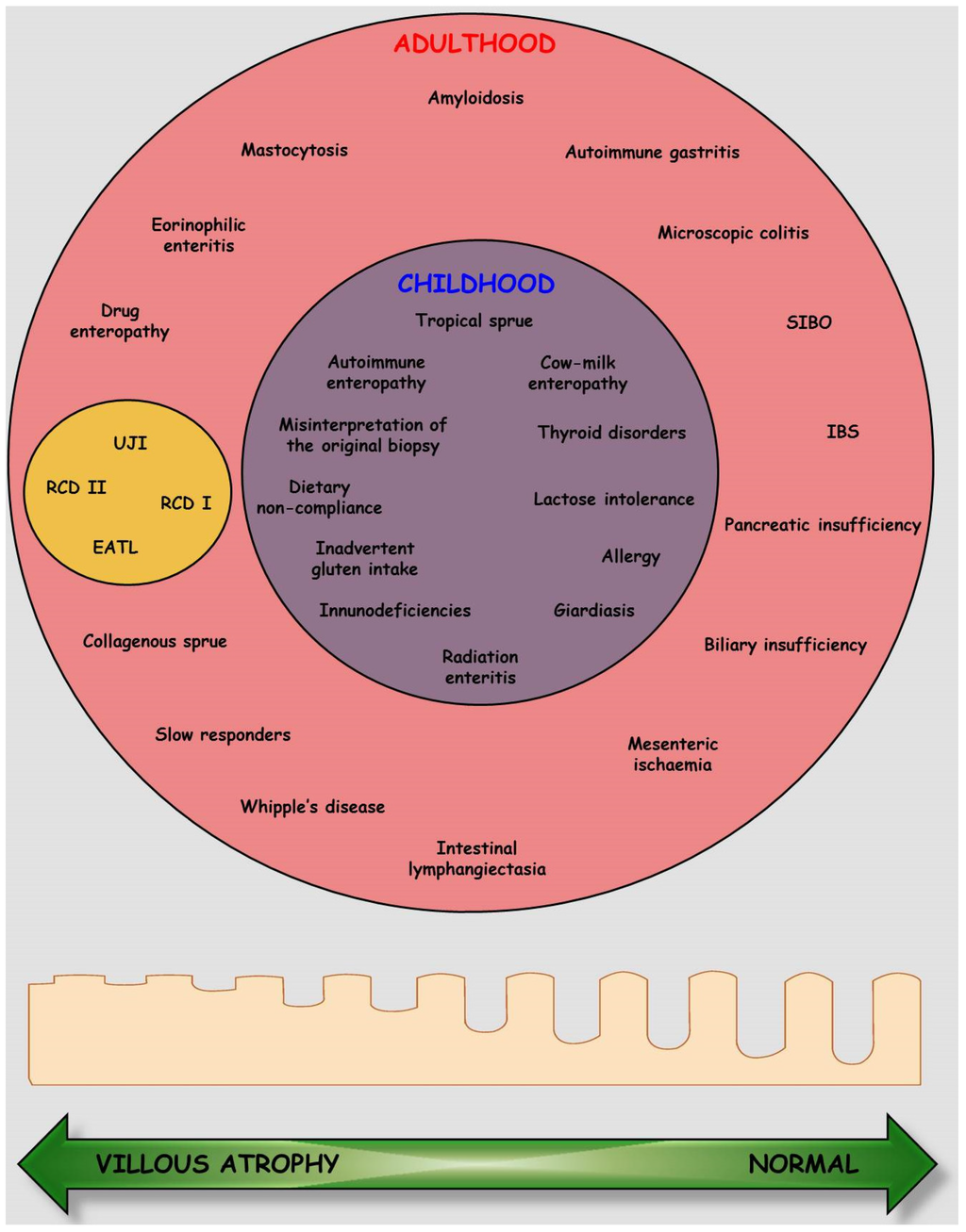 - Mooney, P.D.; Evans, K.E.; Singh, S.; Sanders, D.S. Treatment Failure in Coeliac Disease: A practical guide to investigation and treatment of non-responsive and refractory coeliac disease. J. Gastrointestin. Liver Dis. 2012, 21, 197–203. [Google Scholar] [PubMed]