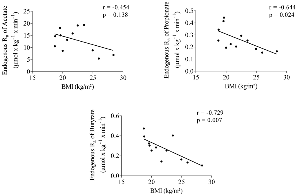 Endogenous Ra of propionate showed a significantly positive correlation with acetate (r = 0.652, p = 0.022). No correlation was observed between the endogenous Ra of butyrate and acetate (r = 0.478, p = 0.116) and between Ra of butyrate and propionate (r = 0.551, p = 0.063). Propionate (r = −0.644, p = 0.024) and butyrate (r = −0.729, p = 0.007) endogenous Ra were significantly negatively correlated with body mass index (BMI) (Figure 1).