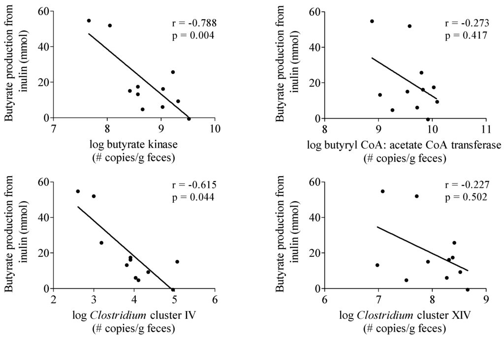 To investigate whether the production of butyrate from inulin depended on the intestinal microbiota composition of the subjects, the butyrate-producing capacity in a fecal sample obtained from each subject was determined (Table 2). No correlation was observed between butyrate production from inulin and butyrate butyryl-CoA:acetate CoA-transferase and Clostridium cluster XIVa genes (Figure 3). In contrast, butyrate production was negatively correlated with butyrate kinase (r = −0.788, p = 0.004) and Clostridium cluster IV genes (r = −0.615, p = 0.044) (Figure 3).