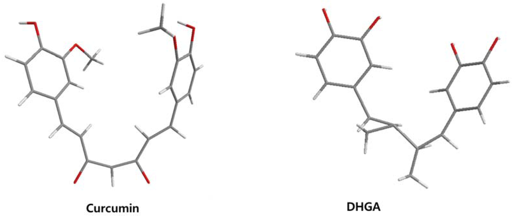 The lowest energy conformation of curcumin and DHGA.