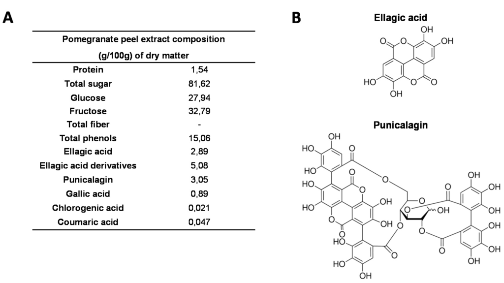 Composition of pomegranate peel extract (PGPE). (A) Chemical composition of PGPE (g/100 g dry matter). (B) Chemical structure of ellagic acid and punicalagin, the two major polyphenolic compounds of PGPE.