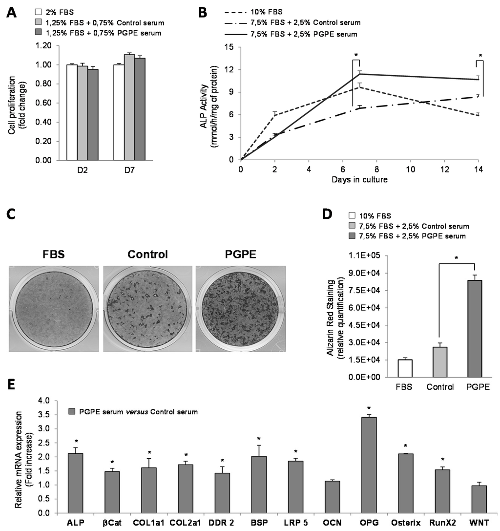 To insure that mouse sera (harvested from mice fed either a standard diet (Control) or the control diet enriched with PGPE) were not deleterious for MC3T3-E1 cells, a cell viability test was performed. Incubation with serum from PGPE animals did not modify the proliferation of the MC3T3-E1 cells, on days 2 and 7, in comparison with cells cultured with serum from CT mice (Figure 2A).