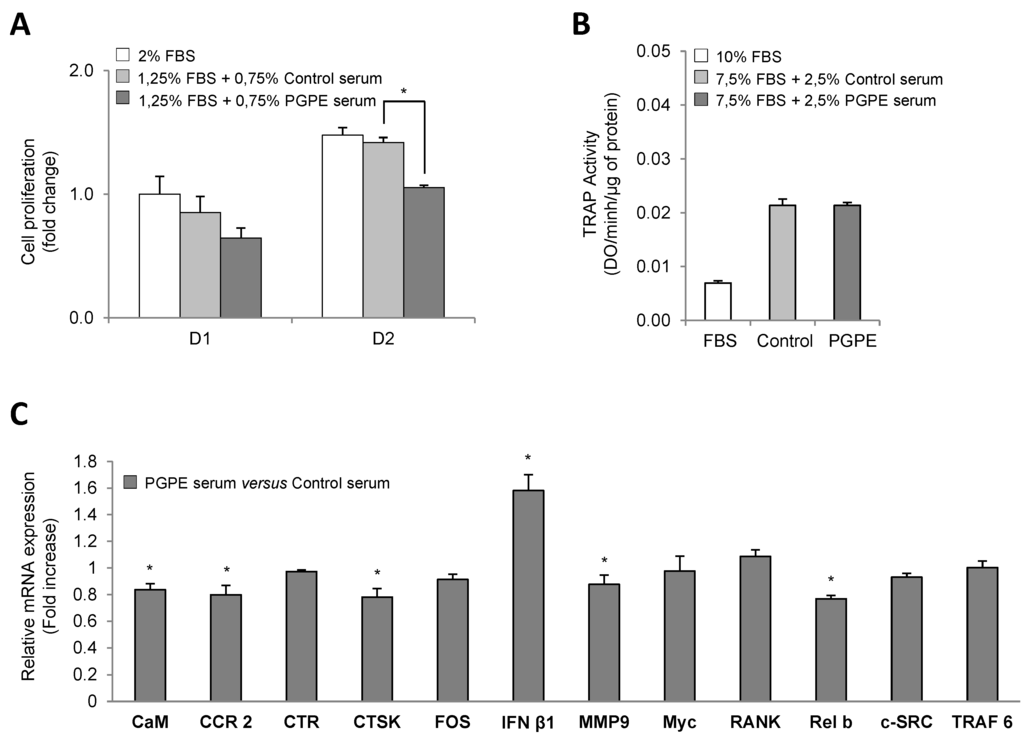 We assessed the TRAP activity in RAW264.7 cells after three days of culture to determine whether serum from PGPE mice was able to reduce osteoclast differentiation. As described in Figure 3B, exposure to mouse serum was associated with an increase of such a parameter. However, PGPE did not elicit any change compared to observations using serum from control mice.