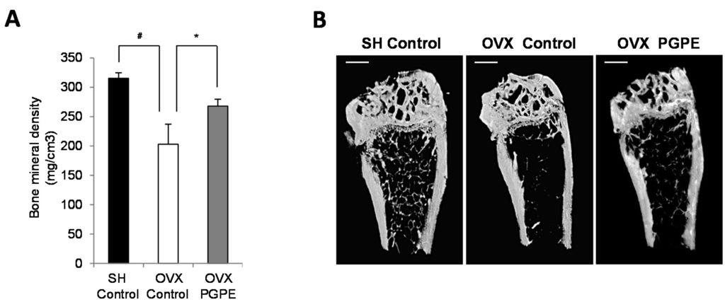 3.3.2. PGPE Consumption Improved Bone Mineral Density in Ovariectomized Mice