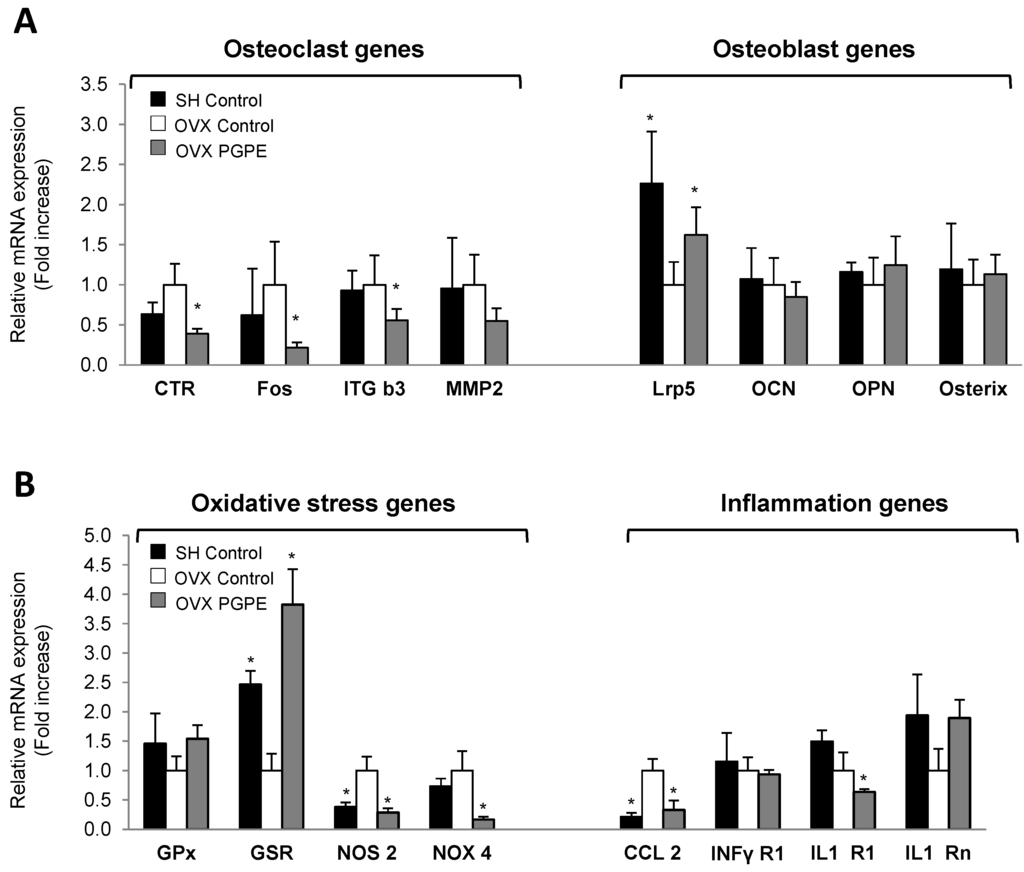To elucidate the possible molecular mechanisms involved in this effect on bone morphology and to confirm the in vitro findings, we performed a transcriptomic analysis on bone tissue samples using Taqman Low Density Arrays (TLDA, Applied Biosystems, Life Technologies, Saint Aubin, France). Because of the large number of genes modulated, only the most important bone markers are presented. Data on the OVX PGPE group were compared to the data measured for the OVX Control group. The TLDA data on osteoclasts are shown in Figure 5A. Accordingly, PGPE consumption significantly (p < 0.05) down-regulated the mRNA levels of some of the major osteoclast-specific markers: define (0.39 fold) and integrin β3 (ITG b3: 0.56 fold). Fos, a crucial transcription factor for osteoclast differentiation, was also inhibited in the PGPE group (0.22 fold; p < 0.05). Finally, we observed a trend toward down-regulated expression in the OVX PGPE group of a key enzyme for osteoclast activity involved in collagen degradation: the metallo-proteinase 2 (MMP2) (PGt: 0.55; not significant). In addition, regarding the expression of osteoblast-specific markers, the TLDA data presented in Figure 5A show that PGPE consumption by ovariectomized mice was able to significantly improve the expression of a co-receptor implied in Wnt/β-catenin signalling in the osteoblast, LRP5 (1.62 fold; p < 0.05), in comparison with the OVX Control group. However, the other osteoblast markers investigated were not significantly modulated by dietary PGPE.