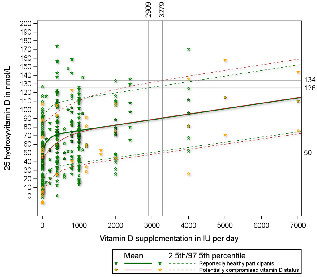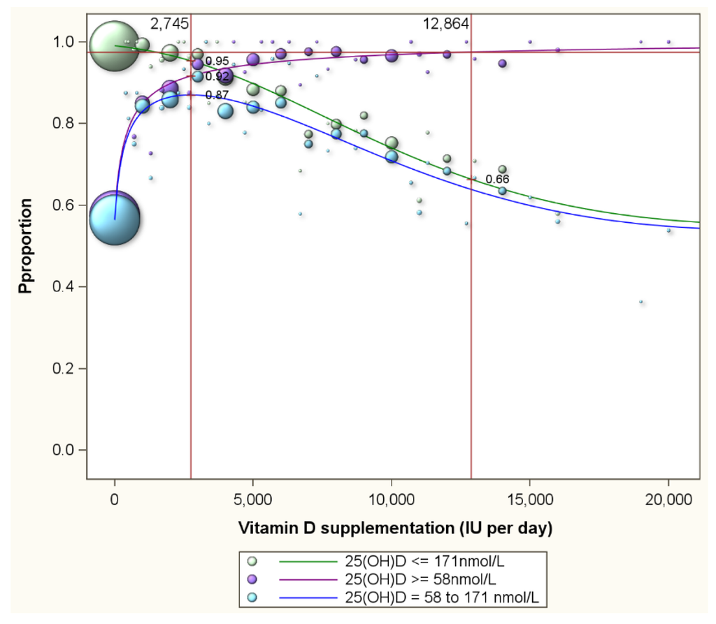 Luxwolda et al. [16] had revealed that natural 25(OH)D concentrations range from 58 to 171 nmol/L. Figure 3 presents the proportion of individuals with serum 25(OH)D concentrations of 58 nmol/L or more by vitamin D supplementation level (the purple line) and the proportion of participants with concentrations of 171 nmol/L or less (the green line). Clearly, with increasing supplementation doses, the proportion of participants with serum 25(OH)D concentrations above 58 nmol/L increases and the proportion with concentrations below 171 nmol/L decreases. Supplementation of 12864 (9930–19,067) IU per day is needed to achieve that 97.5% of participants reach 58 nmol/L or more. At this supplementation level 34% of participants will reach serum 25(OH)D concentrations in excess of the upper limit of the natural range (171 nmol/L). The blue line in Figure 3 represents the proportion of participants that have serum concentrations above 58 nmol/L and below 171 nmol/L. This line is curved and shows that the proportion above 58 nmol/L and below 171 nmol/L peaks at 87% at a supplementation dose of 2745 (2616–3147) IU per day. This peak represents the optimal supplementation dose. At this optimal dose, 8% will have serum 25(OH)D concentrations below 58 nmol/L and 5% in excess of 171 nmol/L (Figure 3).