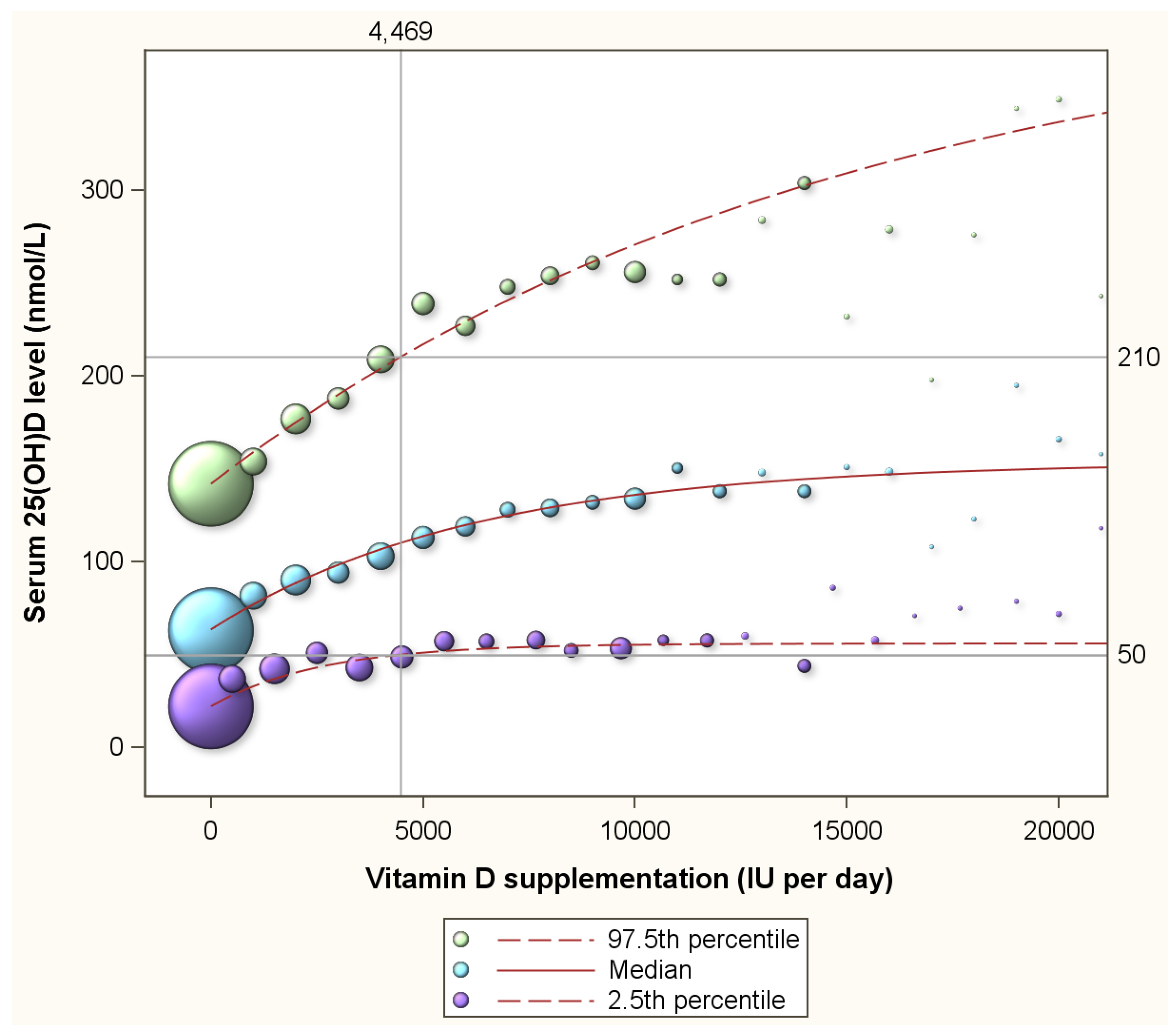 The median and 2.5th and 97.5th percentiles of serum 25(OH)D concentrations by vitamin D supplementation among 11,693 healthy participants of a preventive health program in Canada. Note: The 2.5 percentile line depicts 25(OH)D concentrations for any given vitamin D supplementation dose with 2.5% of all expected 25(OH)D responses to have values below the line, and 97.5% to have values above the line. The 97.5 percentile line depicts 25(OH)D concentrations for any given vitamin D supplementation dose with 97.5% of all expected 25(OH)D responses to have values below the line, and 2.5% to have values above the line. The area between the 2.5 percentile line and the 97.5 percentile line depicts the 95% prediction interval of 25(OH)D concentrations for any given vitamin D supplementation dose. The median, the 2.5th and 97.5th percentiles were estimated through quantile regression, a statistical approach that accommodates the clearly visible skewness in the distribution of 25(OH)D concentrations.