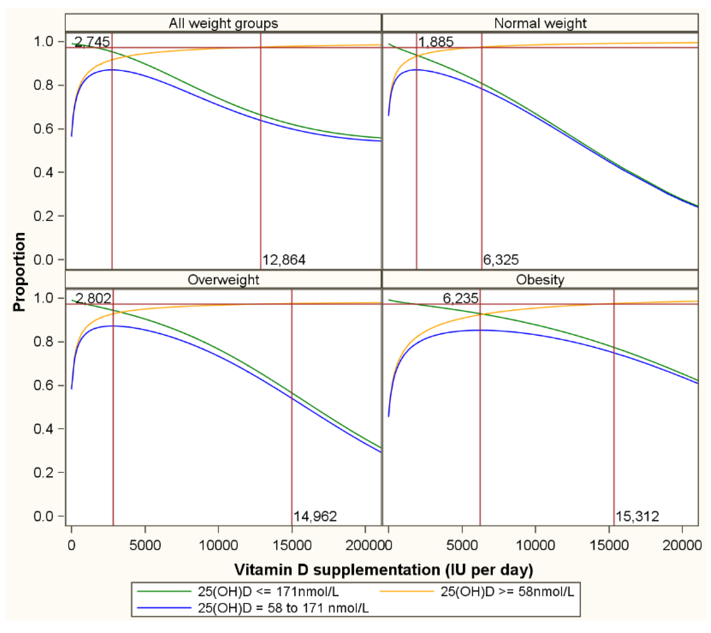Figure 4 is a repeat of Figure 3 for normal weight, overweight and obese subgroups. Optimum proportions of participants with natural serum 25(OH)D concentrations are reached with supplementation with 1885 (1518–2166), 2802 (2400–3666) and 6235 (5943–7004) for normal weight, overweight and obese participants respectively. The lower target of 58 nmol/L and the upper target of 171 nmol/L applied in figures 3 and 4 were just examples to illustrate the concept. Table 2 presents for several combinations of lower and upper serum 25(OH)D targets the vitamin D supplementation needed to maximize the probability to achieve serum 25(OH)D concentrations between the lower and upper target.