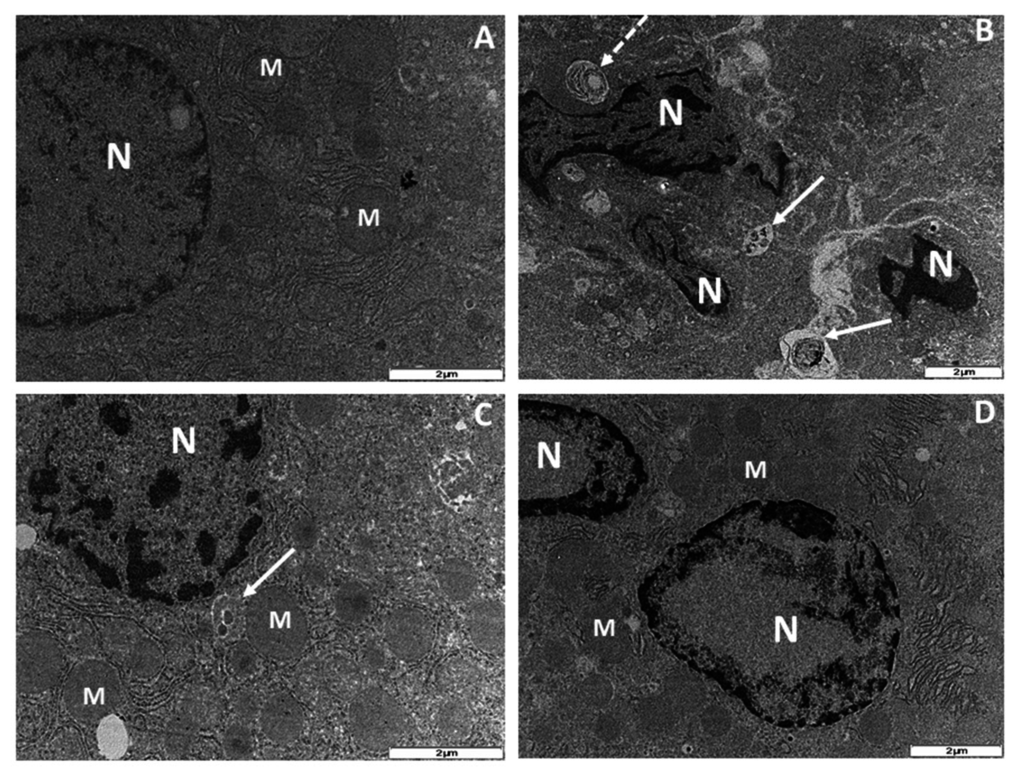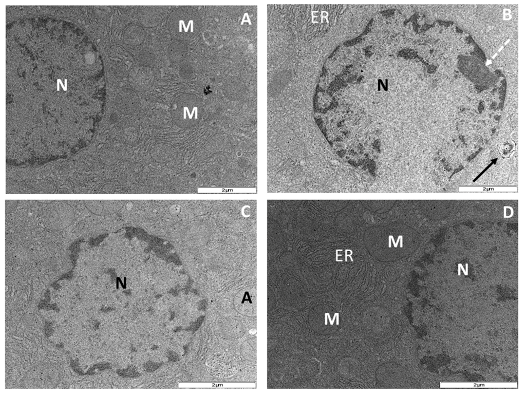 | Treatment Group | Nuclear Clumping and Fragmentation (% of Control) | Damaged Nuclear Membrane (% of Control) | Phagolysosomes (as a Fraction of the Control) | Apoptotic Bodies (as a Fraction of the Control) |