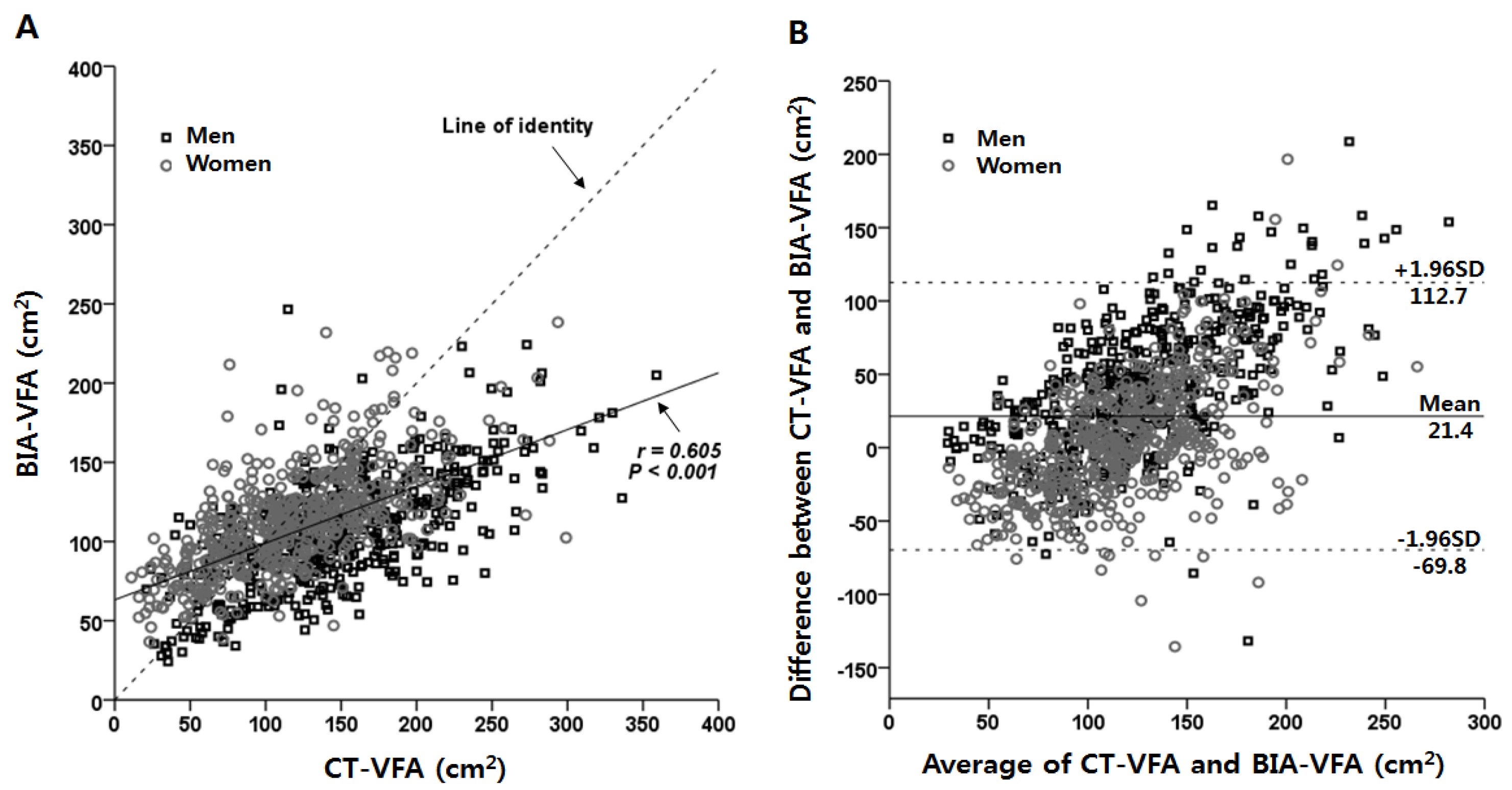 In this study, abdominal VFAs estimated by BIA were significantly correlated with those measured by CT (r = 0.605, p < 0.001). However, the concordance rate between BIA and CT in abdominal VFAs differed according to BMI and age groups by gender. The concordance rate was quite high in women (mean difference = 5.4 ± 39.2 cm2 and ICC = 0.577) whereas there was a larger difference in men (mean difference = 38.2 ± 45.9 cm2 and ICC = 0.438). Differences in the VFAs between the two methods changed with BMI. The BIA method used in this study overestimated VFAs in those with BMI < 20 kg/m2 and underestimated VFAs in those with BMI ≥ 20 kg/m2 with a dose-dependent relationship. Among the age groups, the BIA method estimated abdominal VFAs well in the age range of 19–39 years whereas it underestimated the CT-VFAs in those aged over 40 years.