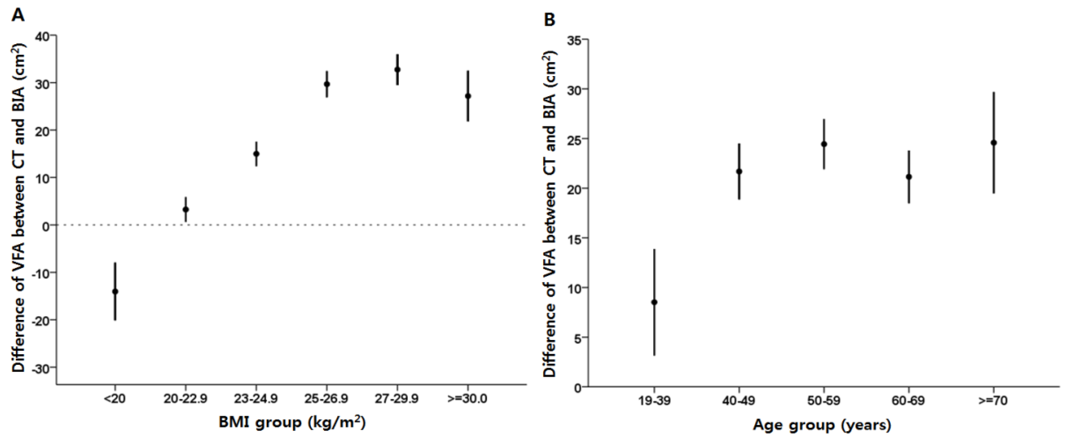 Differences in VFA between CT and BIA methods according to BMI (A) and subjects age (B).