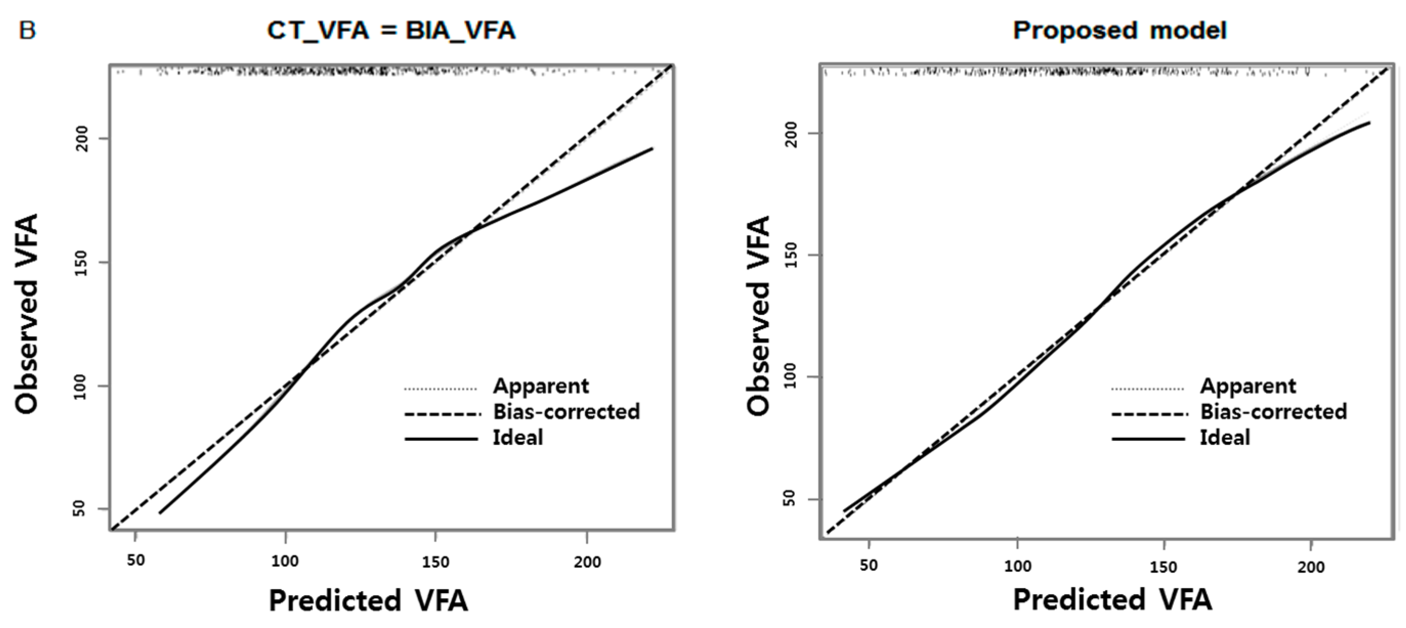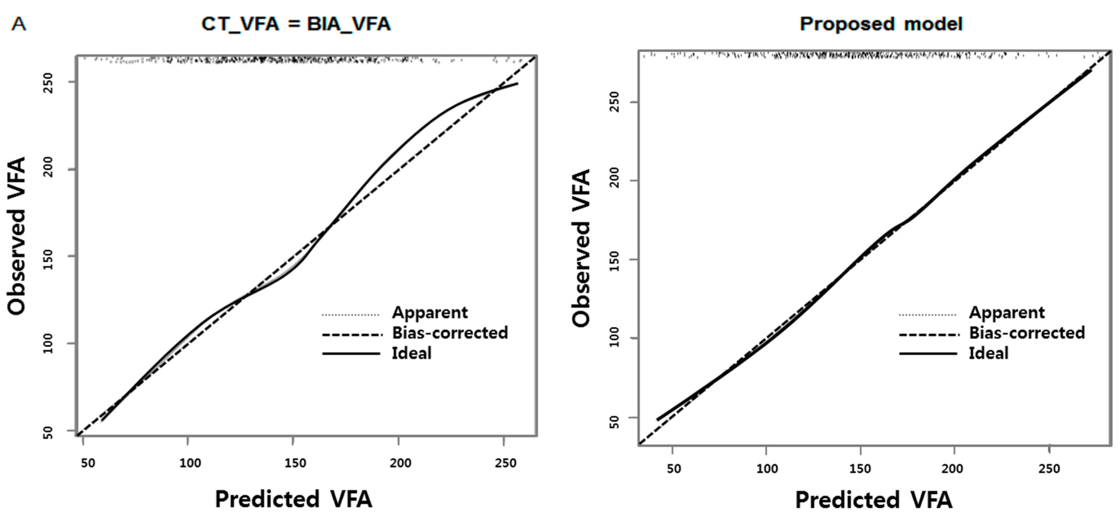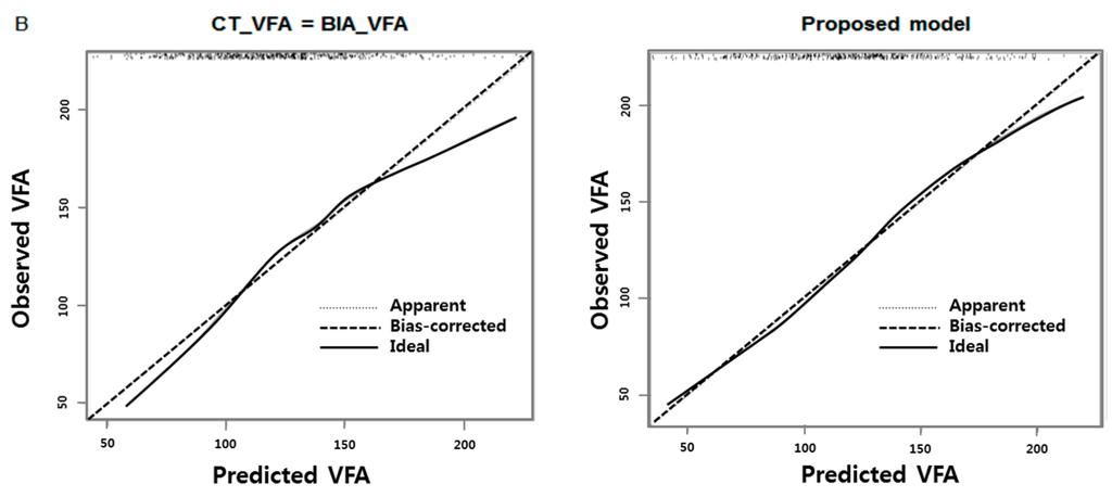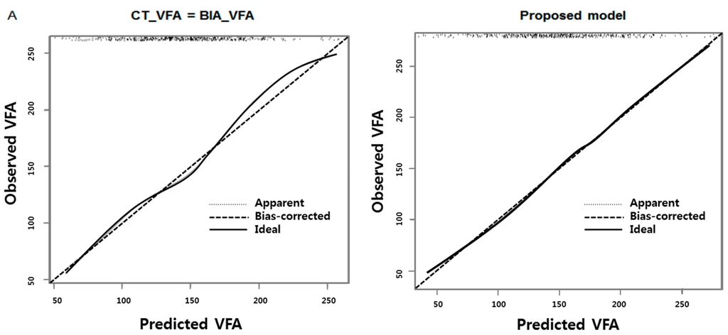 To estimate VFA from BIA more accurately for referencing against VFA values by CT, multiple linear regression models were developed for each gender using age, BMI, and VFA value obtained from the BIA machine. These independent factors were chosen based on clinical judgments. For continuous factors such as VFA estimated by BIA and BMI, a linear relationship was set after investigating nonlinearity through restricted cubic splines. Potential interaction effects were examined using the backward stepwise selection method and the final model was derived based on the Akaike Information Criterion (AIC) and Bayesian Information Criterion [21]. Calibration was performed using a graphical plot of either the apparent or the bias-corrected predictions on the X-axis and the observations on the Y-axis. All statistical analyses were performed using SPSS for Windows version 22.0 (IBM Corp., Armonk, NY, USA) and R program version 3.2.0 (R Foundation for Statistical Computing, Vienna, Austria).