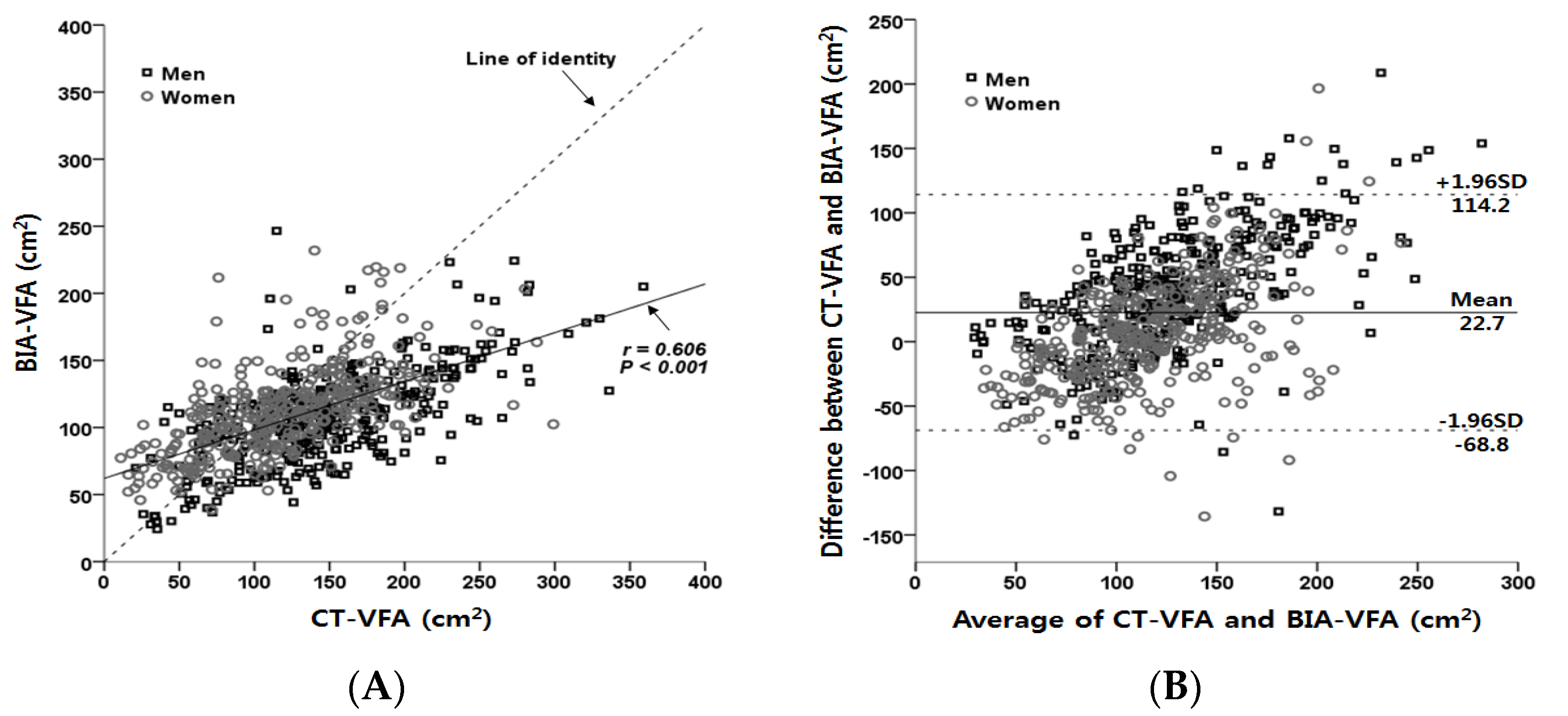 Correlation between VFA measured by CT and VFA estimated by BIA (A) and Bland-Altman plot for comparing the two methods (B).