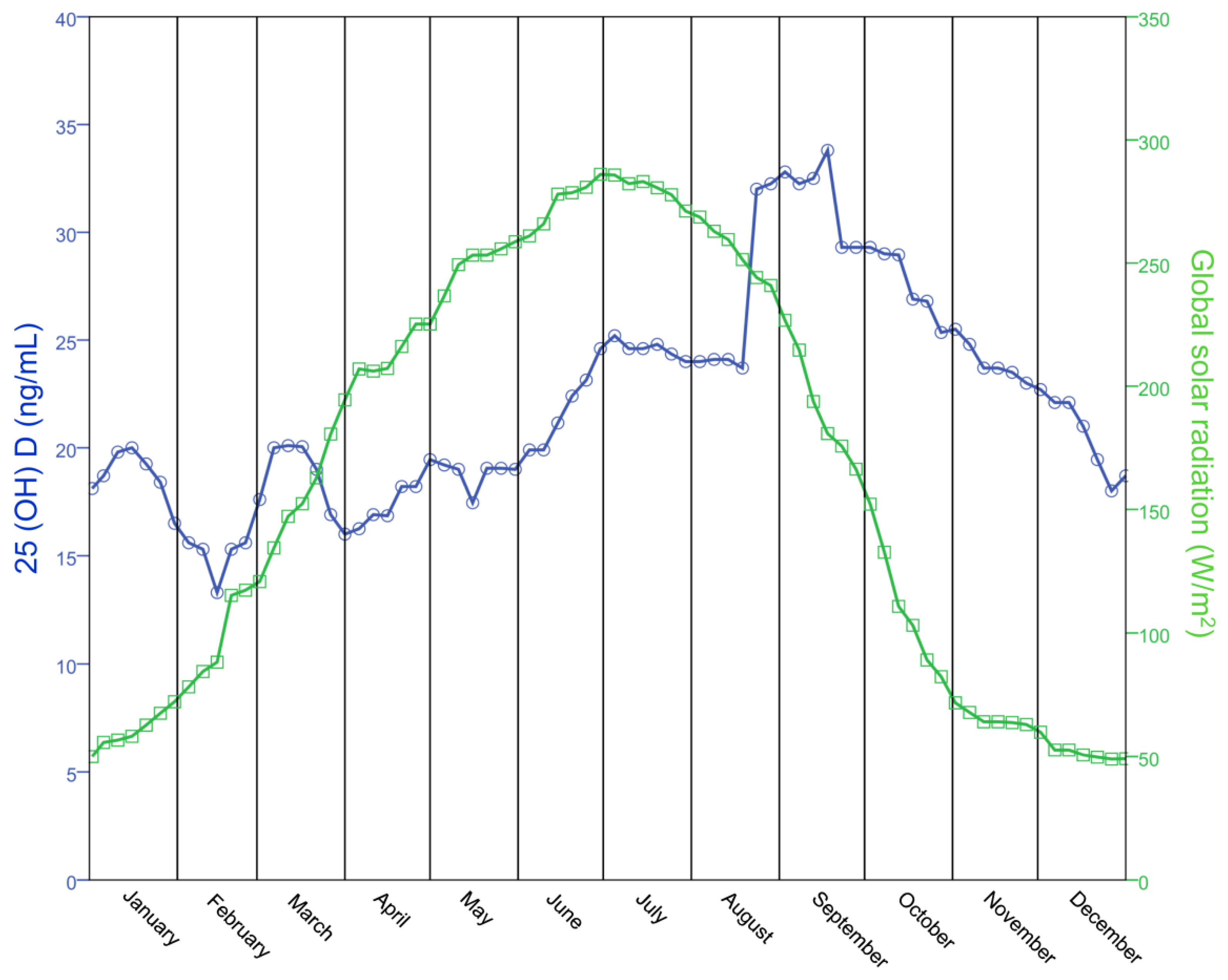 Relationship between solar radiation and 25(OH)D levels. Annual levels for global solar radiation is represented with green open squares and is compared to the moving median of 25(OH)D concentration (blue open circles).
