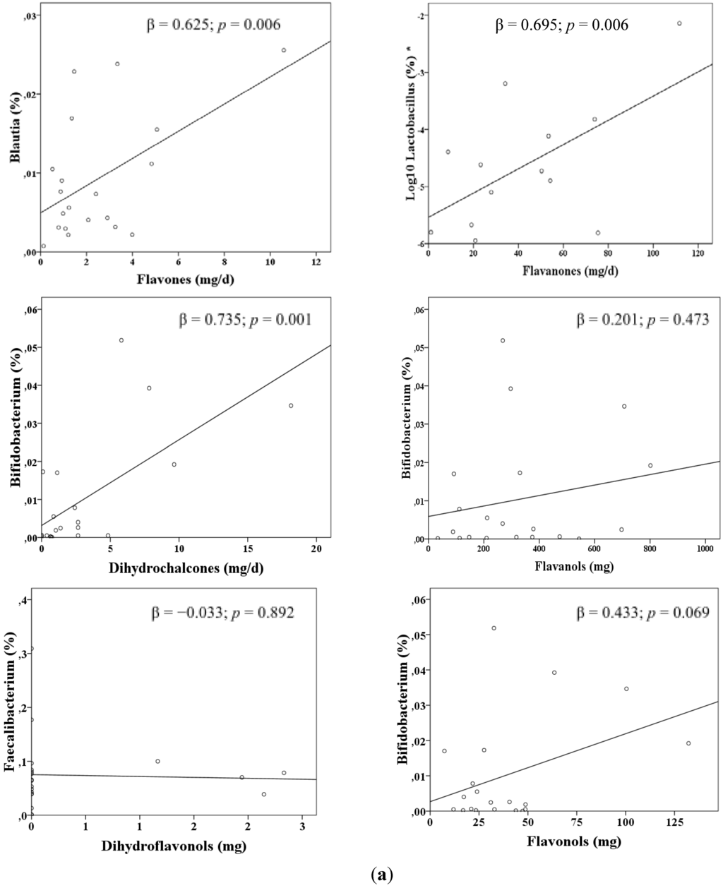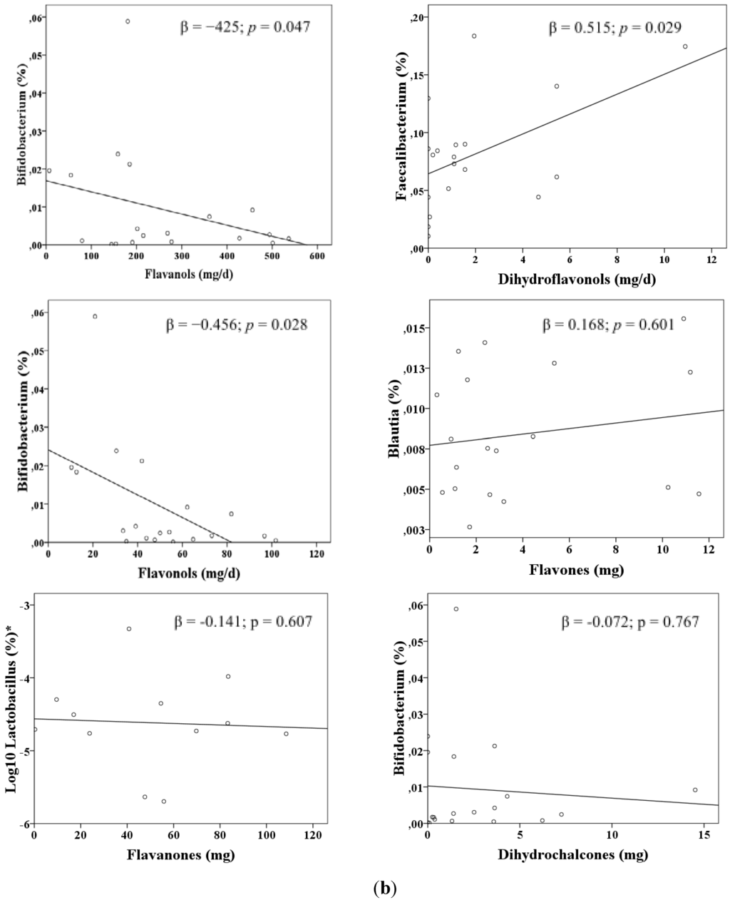 (a) Linear estimation trends between the intake of some classes of flavonoids and the proportion of selected microbial genera, in systemic lupus erythematosus patients. Results derived from multiple linear regression analyses including age and energy intake as covariates. (b) Linear estimation trends between the intake of some classes of flavonoids and the proportion of selected microbial genera, in controls. Results derived from multiple linear regression analyses including age and energy intake as covariates. * Logarithmically transformed variable.